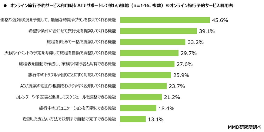 次に、オンライン旅行予約サービス利用時にAIでサポートして欲しい146人を対象に、AIでサポートして欲しい機能を聞いたところ(複数回答可)、「価格や混雑状況を予測して、最適な時期やプランを教えてくれる機能」が45.6%と最も多く、次に「希望や条件に合わせて旅行先を提案してくれる機能」が39.1%、「旅程をまとめて一括で提案してくれる機能」が33.2%となった。