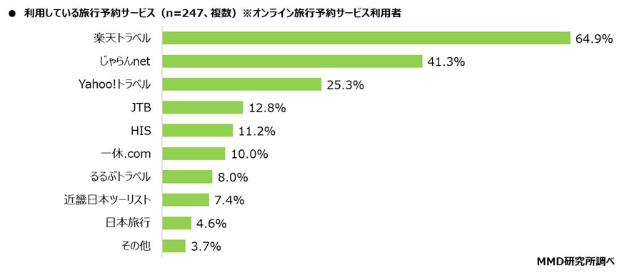 18歳~69歳の男女1,000人のうち、普段オンラインで旅行予約サービスをしている247人を対象に、利用している旅行予約サービスを聞いたところ(複数回答可)、「楽天トラベル」が64.9%と最も多く、次に「じゃらんnet」が41.3%、「Yahoo!トラベル」が25.3%となった。