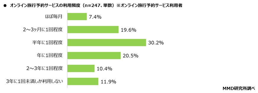 オンライン旅行予約サービス利用者247人を対象に、オンライン旅行予約サービスの利用頻度を聞いたところ、「半年に1回程度」が30.2%と最も多く、次に「年に1回程度」が20.5%、「2~3ヶ月に1回程度」が19.6%となった。