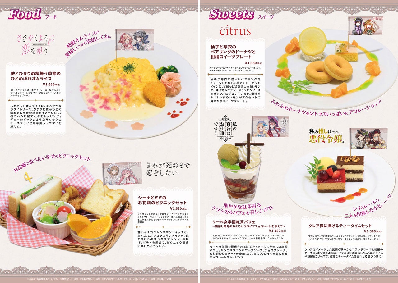 『ささやくように恋を唄う』『きみが死ぬまで恋をしたい』のフードや、『私の推しは悪役令嬢。』『citrus』『私の百合はお仕事です!』のスイーツをはじめ、各作品をイメージしたドリンクをご用意。 さらに、開催期間を前期/後期に分け、各作品のキャラクターたちをイメージしたコラボドリンクをラインナップします。
