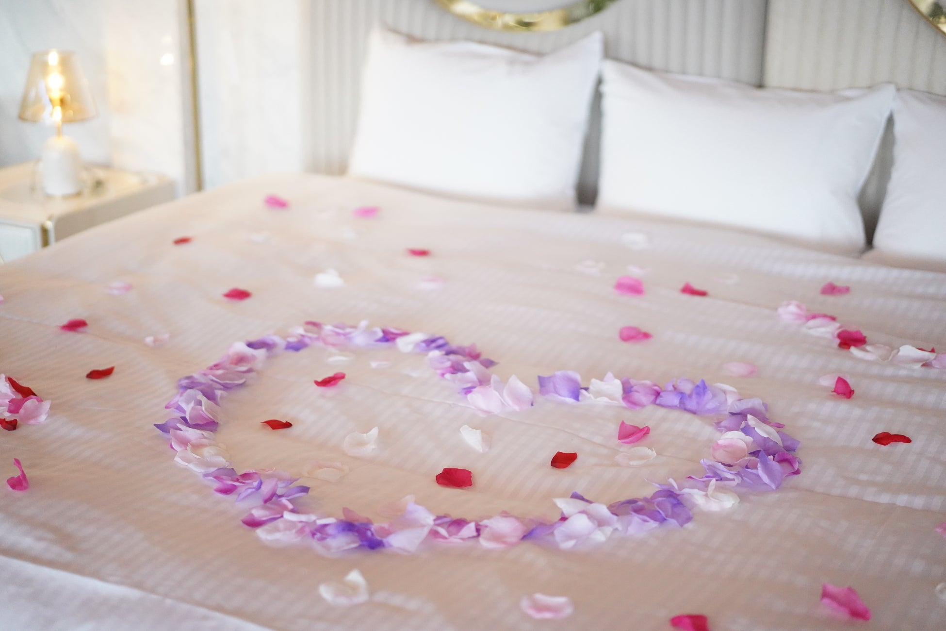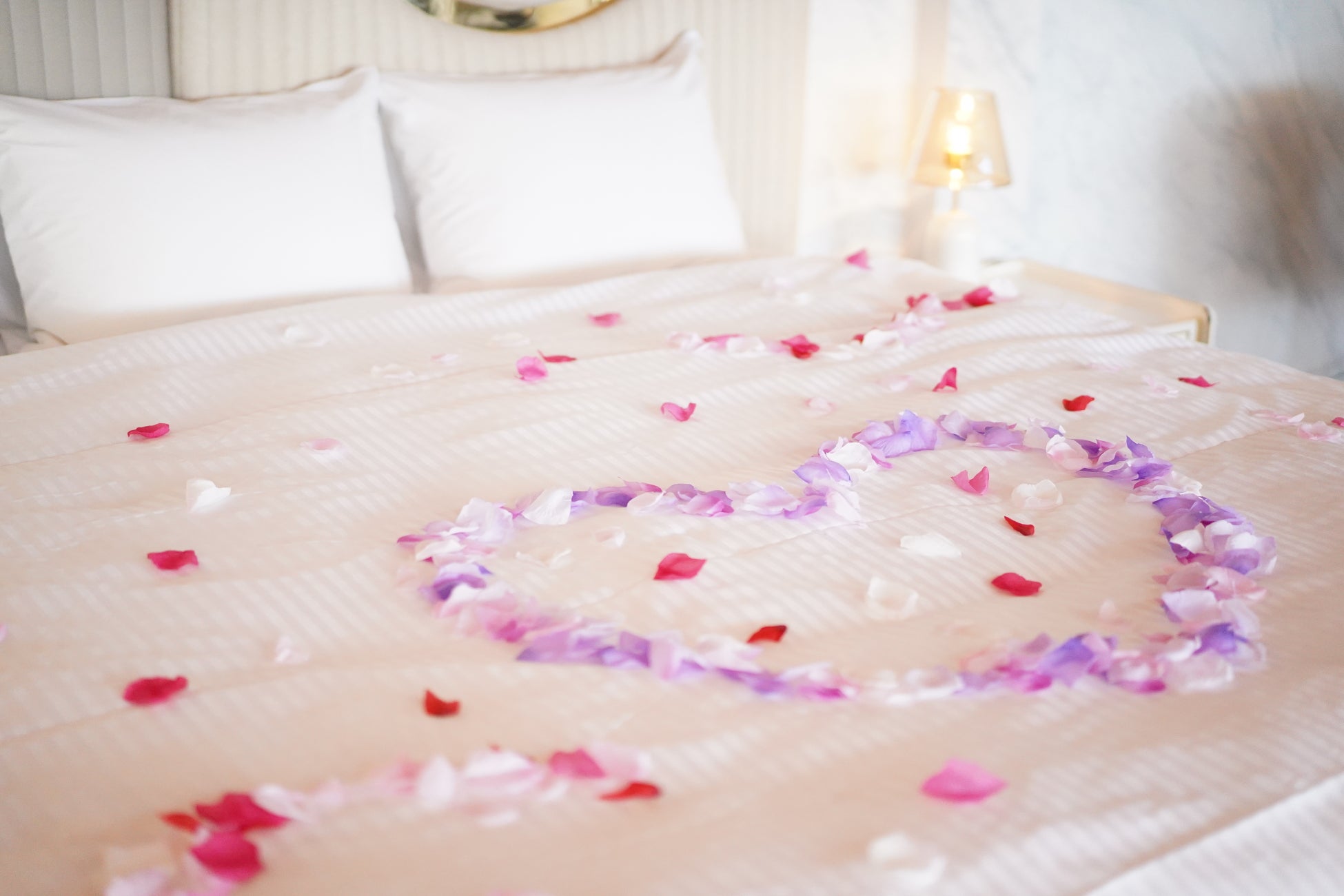 ベッドの上に美しく散りばめられた花びらが、落ち着きのあるロマンティックな空間へと導きます。