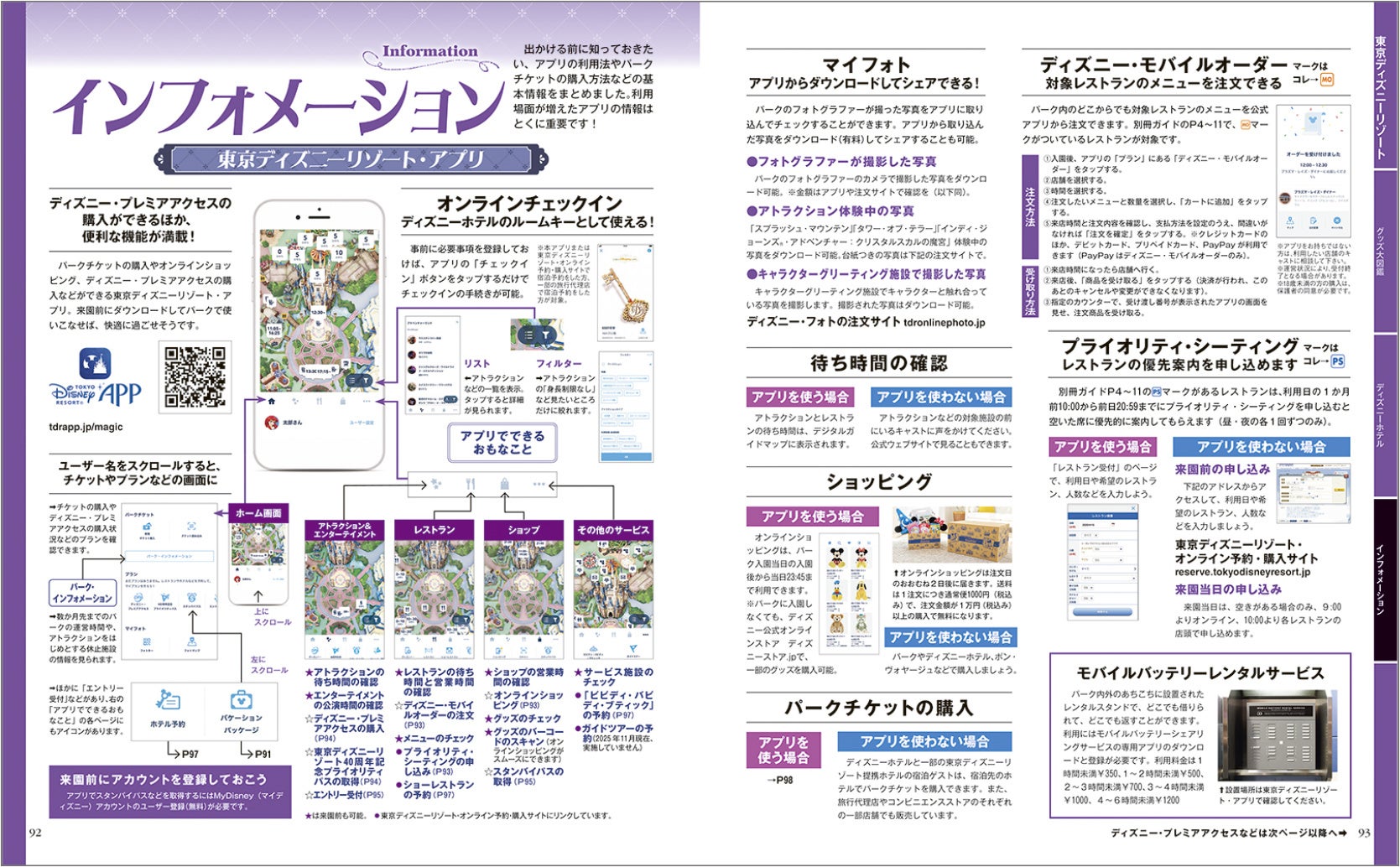 巻末8ページで紹介しているインフォメーションページを読んでおけば安心です。「東京ディズニーリゾート・アプリ」の便利な機能を詳しく解説! 対象レストランのメニューをアプリで注文できる「ディズニー・モバイルオーダー」、レストランの優先案内を申し込める「プライオリティ・シーティング」、対象のアトラクションの短い待ち時間で体験できる「ディズニー・プレミアアクセス」、「エントリー受付」や「スタンバイパス」の申し込み方などをチェックしておけば、パークでの楽しみ方が広がります♪