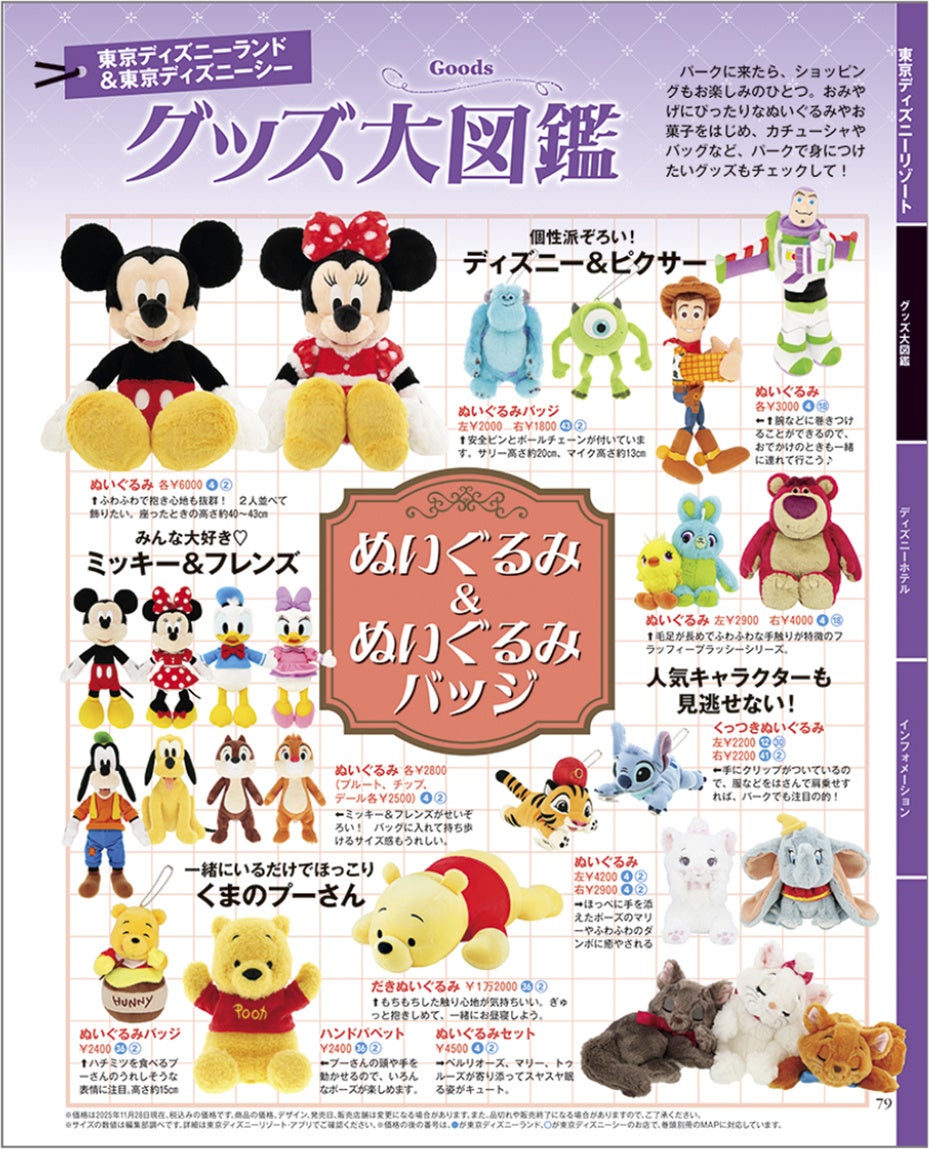 「グッズ大図鑑」のページが役立ちます! ぬいぐるみ&ぬいぐるみバッジ、ファッション&身に着けアイテム、キッチン&インテリアグッズ、お菓子&食品、おもちゃ&ベビー、ステーショナリーなど、アイテム別に人気のグッズを紹介しているので、パークのショップで買いたいグッズをチェックしておきましょう。