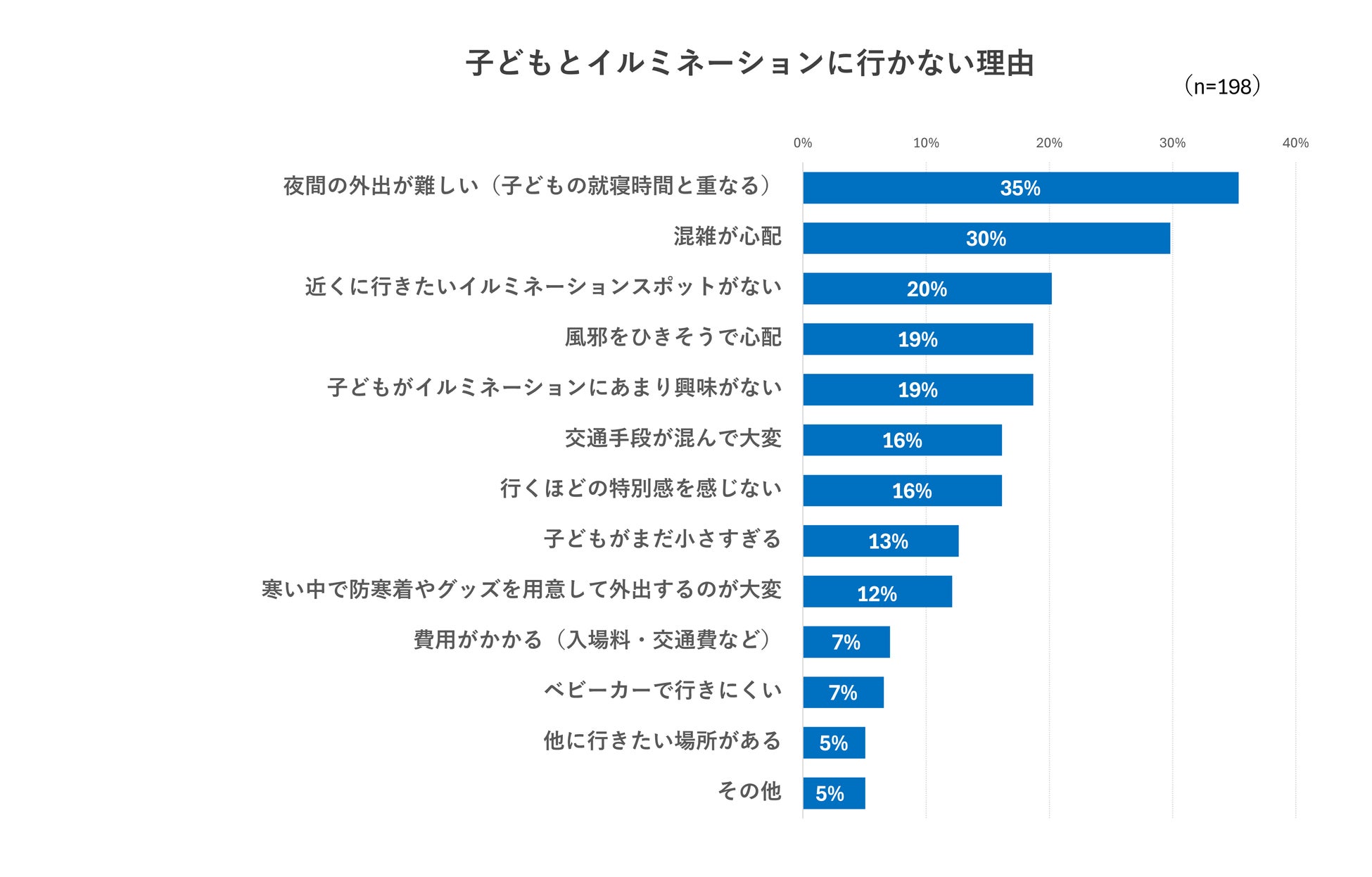最も多かったのは「夜間の外出が難しい(子どもの就寝時間と重なる)」で35% でした。イルミネーションは暗くなってからが本番のイベント。そのため、小さな子どもがいる家庭では、
