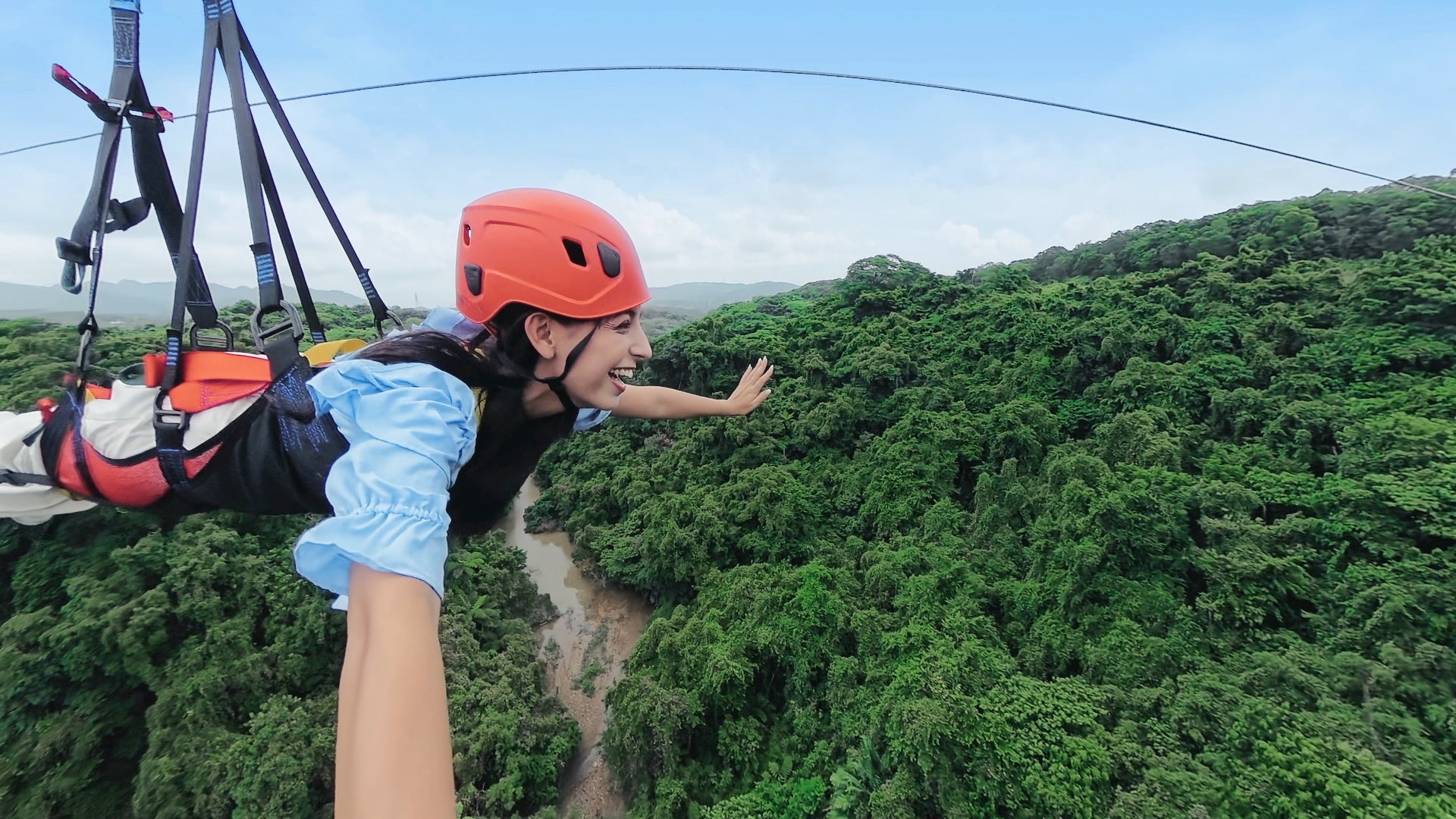 やんばるの絶景を見渡しながら、美しい青空に向かって放り投げられる
