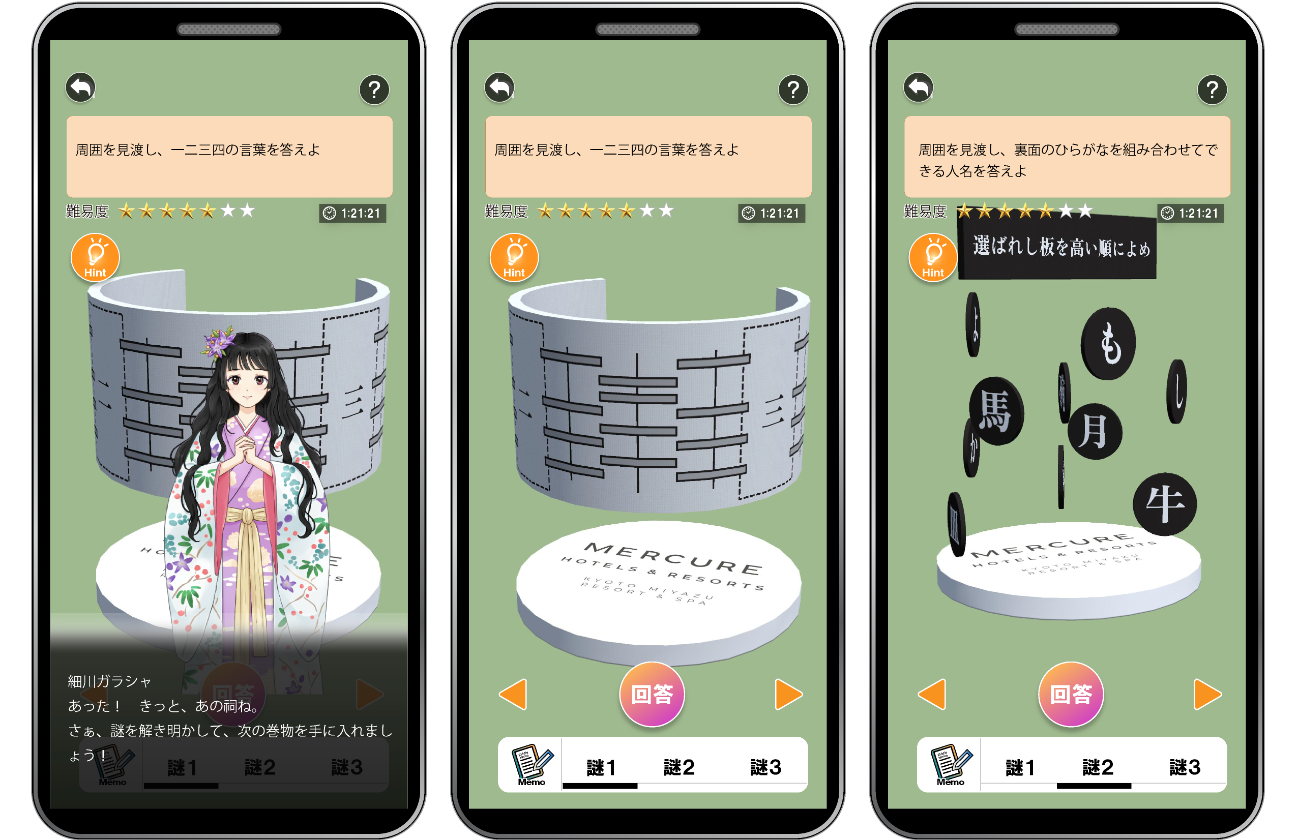 メルキュール京都宮津リゾート&スパの謎解きでは、タイムスリップしたお客様は丹後七姫のひとりであるガラシャと共にホテル内を歩き、周囲の景観をヒントに謎を解き明かしていきます。ホテル内を丹後国に見立て、丹後に伝わる丹後七姫の伝説について触れながら、歴史の舞台とホテル空間を重ね合わせた世界観を体験していただきます。「姫君の物語」を求め、ホテルの各所に設置された謎を解くことで、まるで丹後各地(伊根、磯砂山、立岩、磯の浜辺、由良の湊)を巡るような感覚を楽しめます。