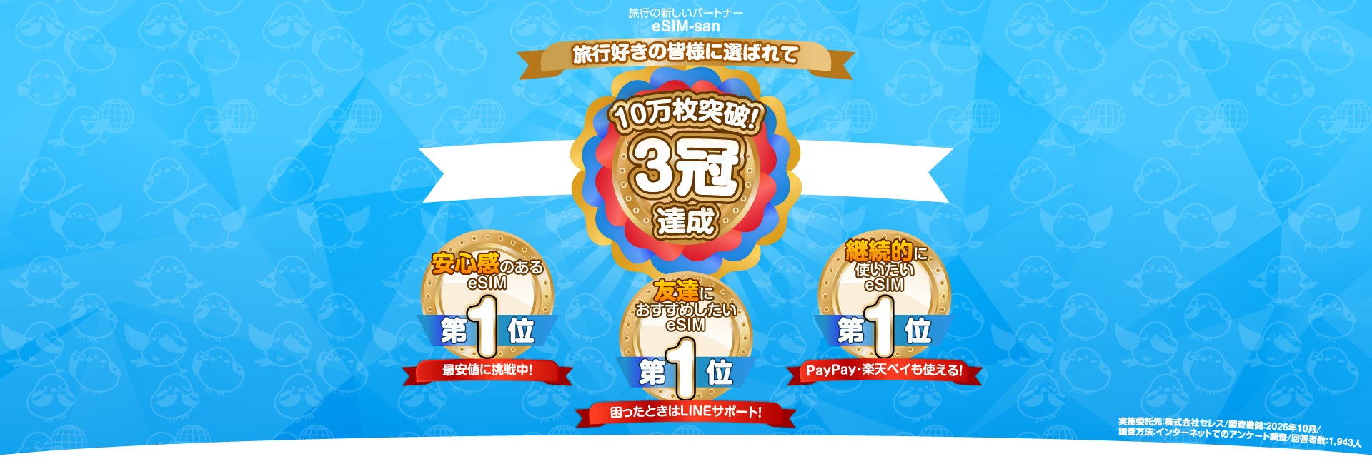 eSIM-san(イーシムさん)はeSIMを利用したモバイル通信サービスです。業界最安値にも挑戦中!海外渡航者向けで世界200以上の国と地域で、即日利用可能です。