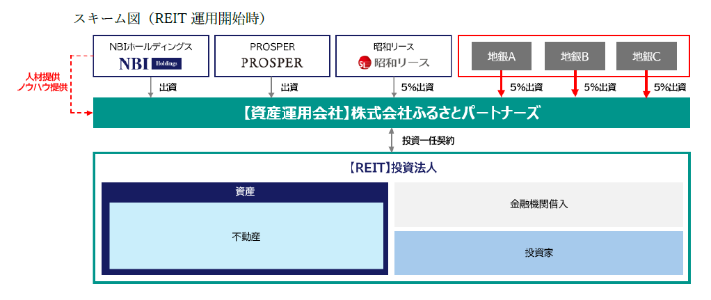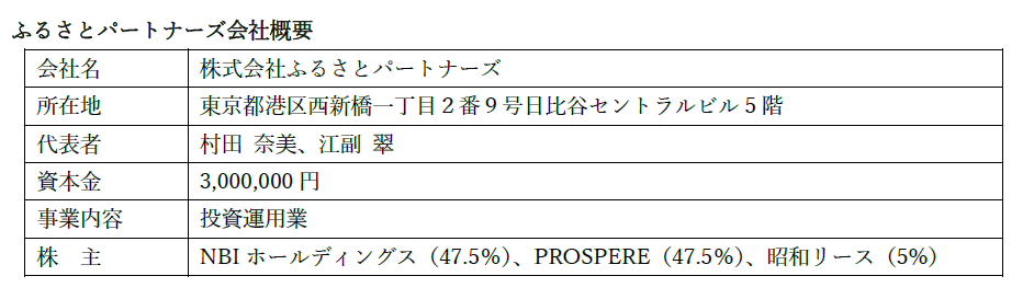 「不動産を軸としたアプローチ」のNBIホールディングスに、「企業投資を軸としたアプローチ」をするPROSPERが加わることにより、両社の地方創生のコンセプトが融合し、更には両社のパイプラインが合わさることにより早期に資産規模が拡大し、地方活性化に資するREIT組成の蓋然性がより高まると考え、今回の「ふるさとパートナーズ」の設立に至りました。