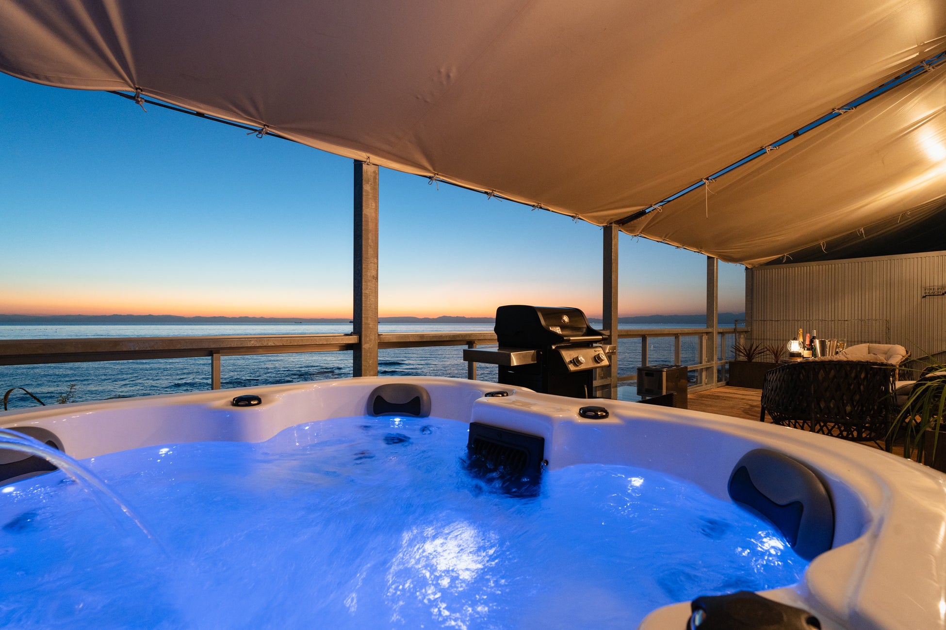 伊勢湾の波音と夕景を望む客室、プライベートテラスでのBBQ、ジャグジーなどを備え、贅沢なリゾート体験を提供しています。