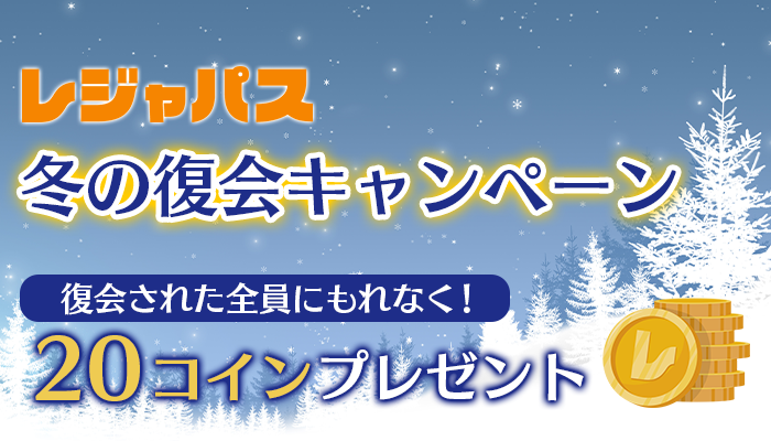 レジャパスでは、休会中の方を対象に、期間限定で「冬の復会キャンペーン」を実施いたします。キャンペーン期間中に復会された方全員に、20レジャコインを進呈いたします。