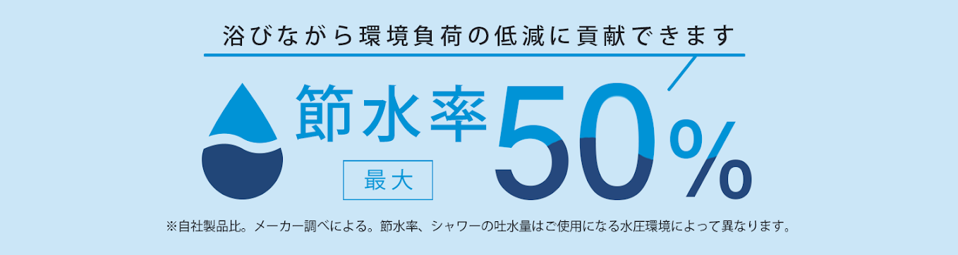 当社独自の特許技術「μ-Jet機構」により、直径が0.1mm(=100μm)未満の気泡であるファインバブル(マイクロバブル、ウルトラファインバブルの総称)を発生させます。当社製品は水流にこだわり、髪や体を洗う“シャワー水流”でこの超微細気泡を発生させ、その過程で最大約50%(※2)の節水効果を発揮します。また、水量だけでなくお湯にするための光熱費も抑えられるので、CO2排出量の削減にも繋がります。