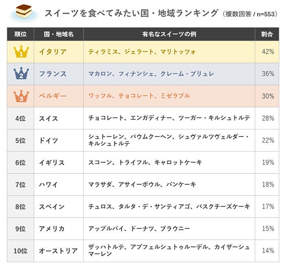 その土地ならではの魅力が詰まったスイーツは、海外旅行の楽しみのひとつ。日本でも人気のティラミスやマカロン、ワッフルといった各国のスイーツを本場で味わう体験は、忘れられないひとときとなります。阪急交通社では、「スイーツを食べてみたい国・地域」に関しての調査を実施。注目の結果を、ランキング形式で紹介します。