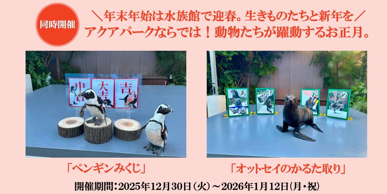 そして、年末年始の特別な時間を楽しむ機会として、「スノウアクアリウム」に加え、お正月コンテンツと特別プランもご用意!「フレンドリータイム」では“かるた取り”をテーマにしたオットセイの生態紹介や、丸太の“おみくじ”をペンギンたちが選び、新年の運勢を占うとともに豆知識も楽しめるプログラムなど、お正月感あふれる内容でお届け!閉館後の特別プランでは、穏やかな夜の水族館を人数限定でゆったりと満喫いただけます。