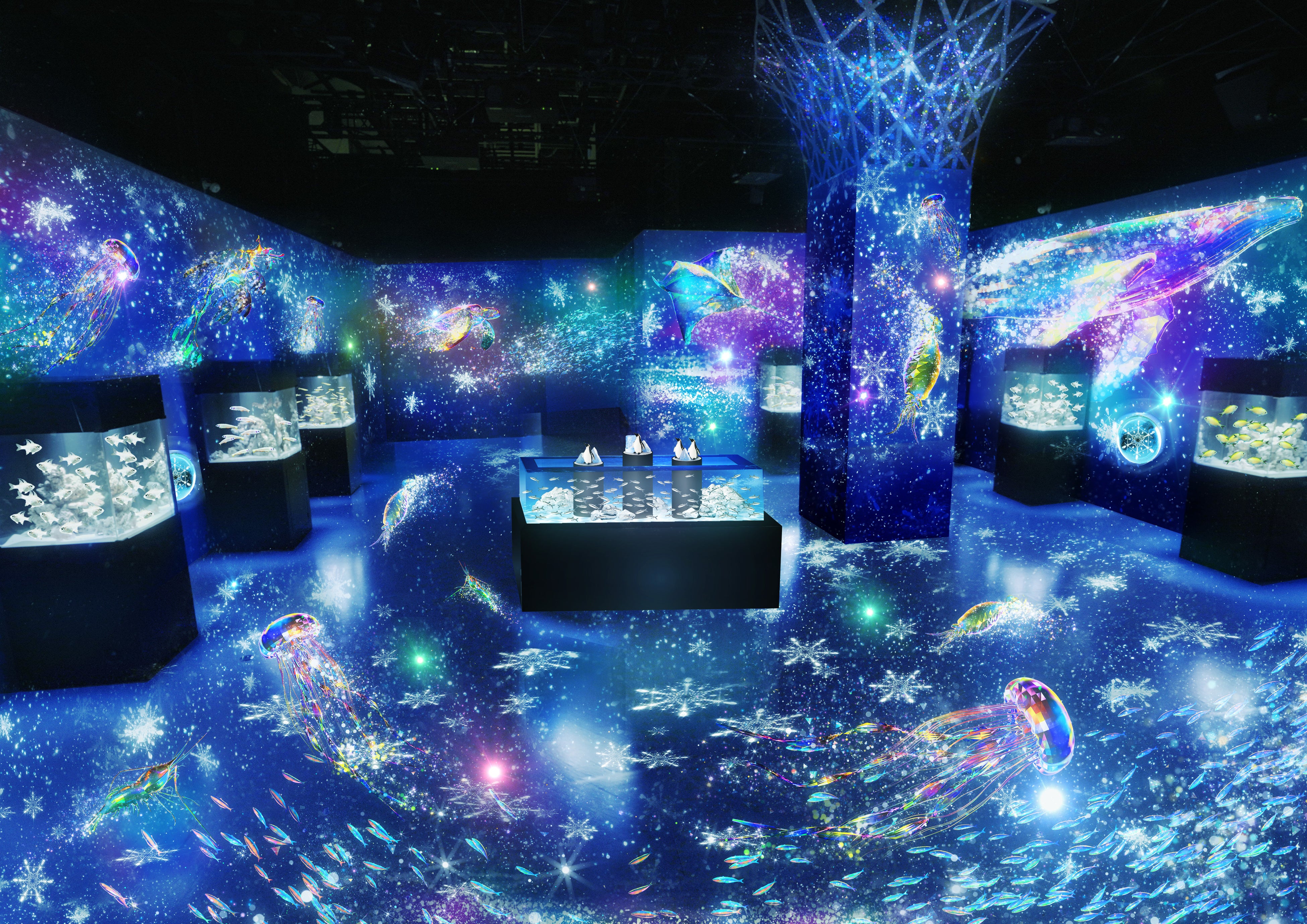 記録的な暖かさが続く影響で、白銀に輝く雪景色や、寒さの中で生まれる氷のアートといった“冬ならでは”の自然に触れられる機会が少なくなると見込まれる今冬。そんな状況の中、当館ではクリエイティブカンパニー 「NAKED, INC.」が手がける雪・クリスタル・オーロラをモチーフにしたデジタルアートと海の生きものが融合する幻想的な冬の世界を都心・屋内にいながら体感いただけます。深いブルーの水中光や氷の粒子を想起させる映像などが広がり、館内全体がまるで“スノウドームの中”のような情景に。水槽展示やパフォーマンスを通して、生きものの躍動とデジタル演出が織りなす非日常の時間を楽しめます。