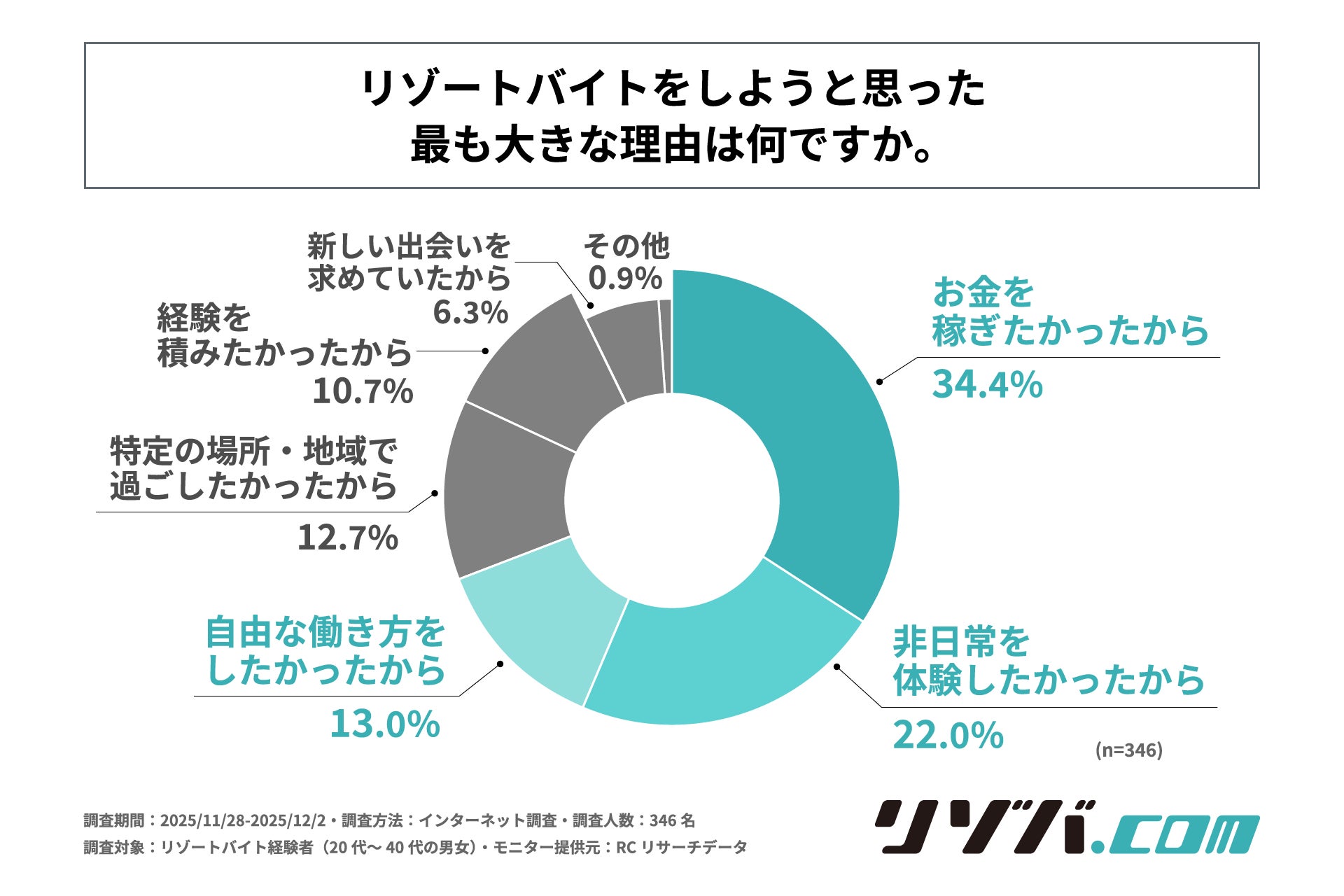 まず、「リゾートバイトをしようと思った最も大きな理由は何か」を尋ねる設問への回答では、1位が「お金を稼ぎたかったから」で34.4%、2位が「非日常を体験したかったから」で22.0%、3位が「自由な働き方をしたかったから」で13.0%という結果になりました。この結果から、リゾートバイトをしようと思った理由は、主に「お金を稼ぎたかったから」や「非日常を体験したかったから」であることがわかりました。