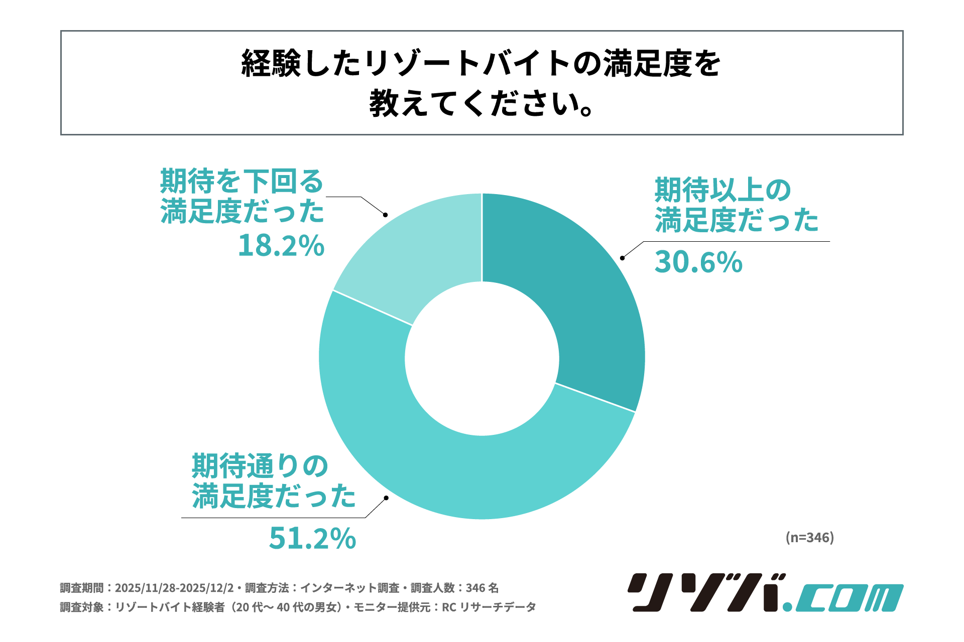 調査の最後、「経験したリゾートバイトの満足度」を尋ねる設問への回答では、1位が「期待通りの満足度だった」で51.2%、2位が「期待以上の満足度だった」で30.6%、3位が「期待を下回る満足度だった」で18.2%という結果になりました。1位と2位の回答を合計すると81.8%となることから、リゾートバイト経験者の8割以上が、経験したリゾートバイトに満足していることが明らかになりました。