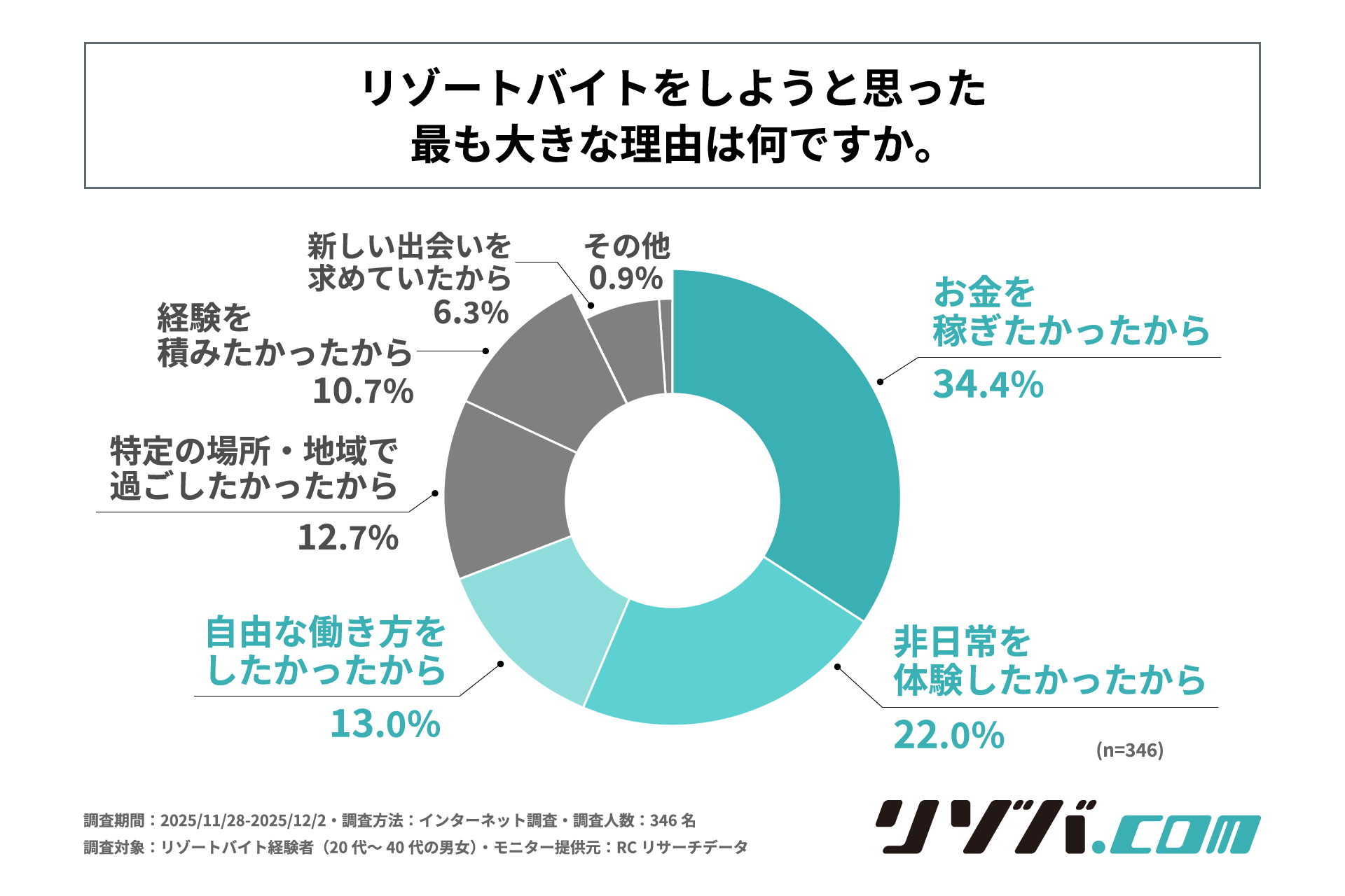 まず、「リゾートバイトをしようと思った最も大きな理由は何か」を尋ねる設問への回答では、1位が「お金を稼ぎたかったから」で34.4%、2位が「非日常を体験したかったから」で22.0%、3位が「自由な働き方をしたかったから」で13.0%という結果になりました。この結果から、リゾートバイトをしようと思った理由は、主に「お金を稼ぎたかったから」や「非日常を体験したかったから」であることがわかりました。