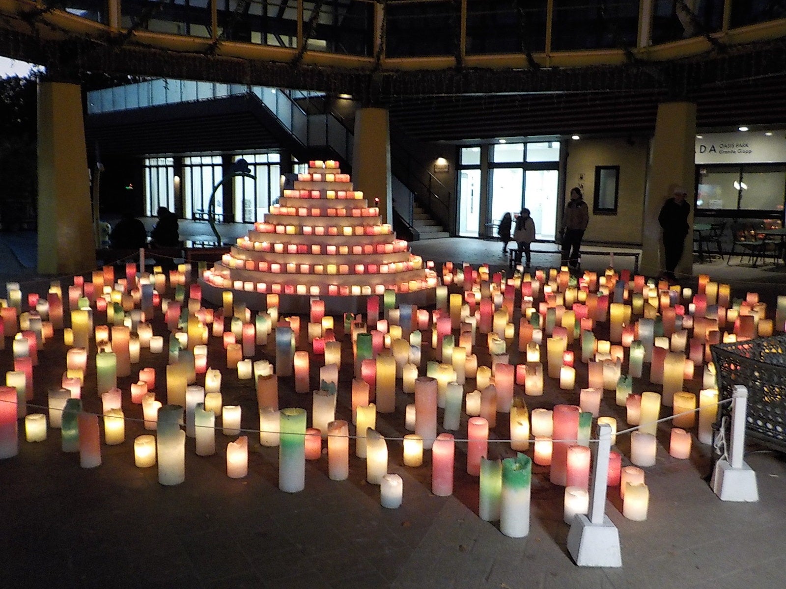 会場であるオアシスパークのガラスドームとにじいろ噴水広場に1600本のキャンドルを展示。