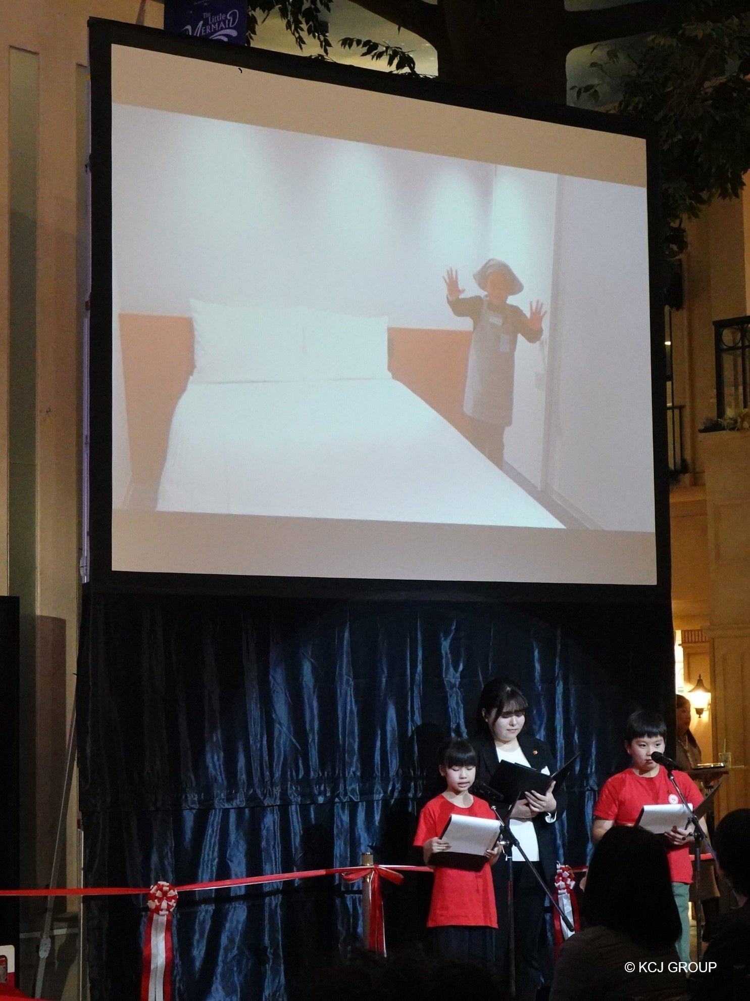 セレモニーは、キッザニア甲子園のこども議会議員が中心となり進行しました。中継カメラに映し出された「ホテル」パビリオンの映像には、「ホテリエ」のユニフォームを着用した瀧澤氏とこどもが登場し、フロントでの「おかえりなさいませ」の挨拶をした後、「ホテリエ」のユニフォームと体験内容を紹介。続いて、客室に進み、「メイクスタッフ」のユニフォームや体験内容を紹介しました。