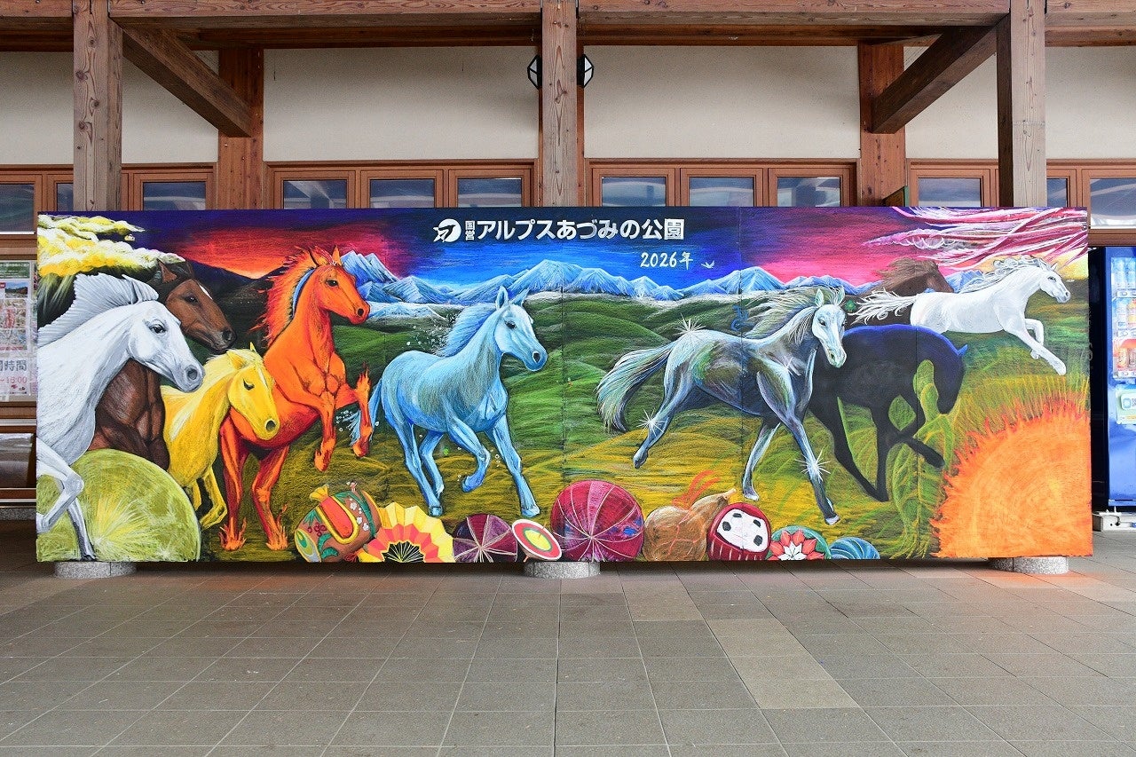 インフォメーションセンターでは、「錦鯉野アキコ」さんによる高さ約1.8m・幅約5.6mの干支「午」の黒板アートがお出迎えします。勢いよく駆ける9頭の馬で「馬九行く(うまくいく)」を表現し、「物事がすべてうまくいきますように」という願いを込めました。新年の幕開けにふさわしいフォトスポットです。