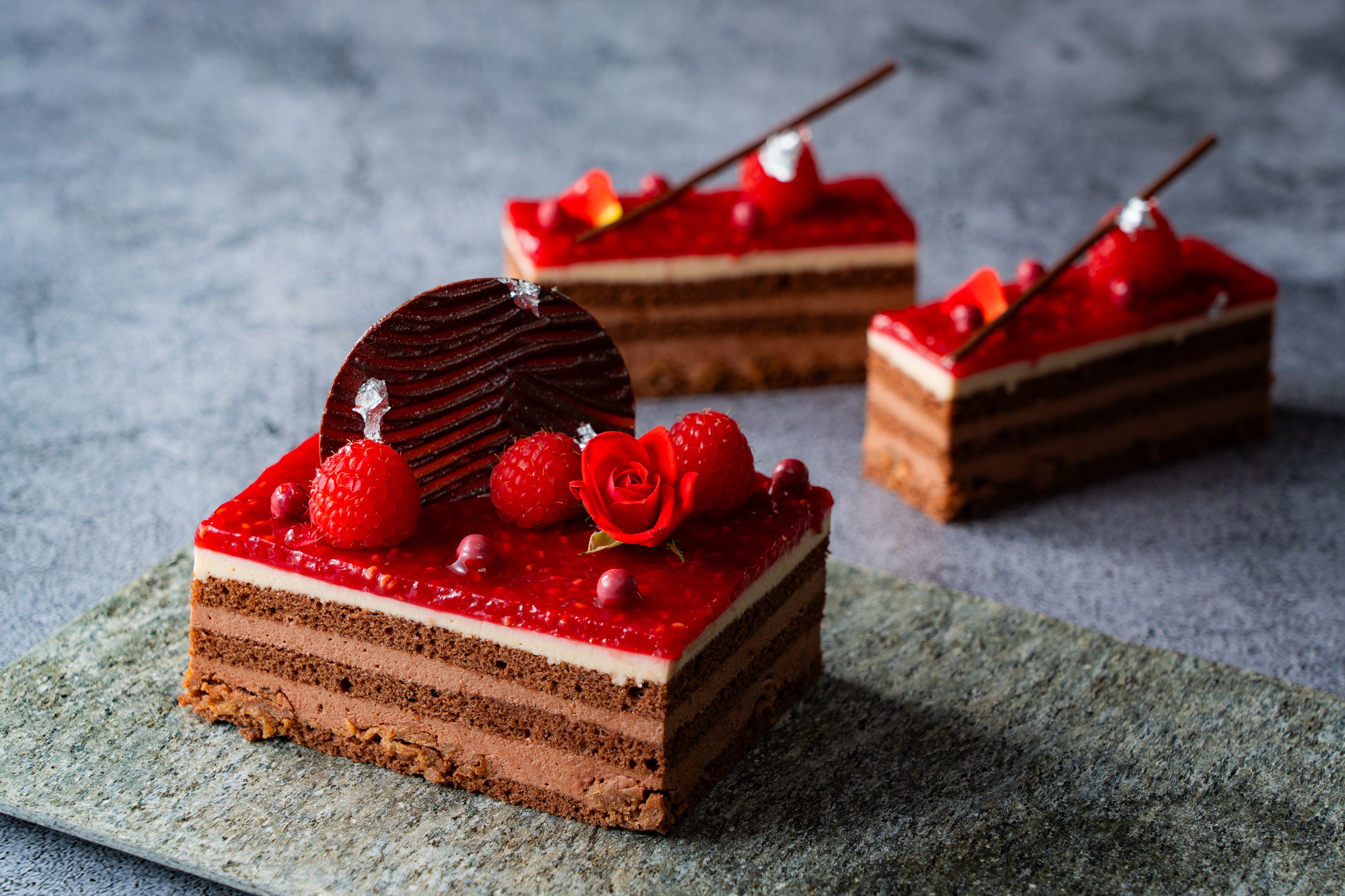 フランボワーズの華やかな酸味となめらかなチョコレートによるマリアージュが心ゆくまで楽しめる王道のチョコレートケーキです。なめらかな口当たりのチョコレートクリームとチョコレートスポンジ、コク深いヘーゼルナッツのムースを重ね、さらにルビー色のフランボワーズジュレを合わせて可憐なバラを添えました。味わい深く、目にも鮮やかな一品です。