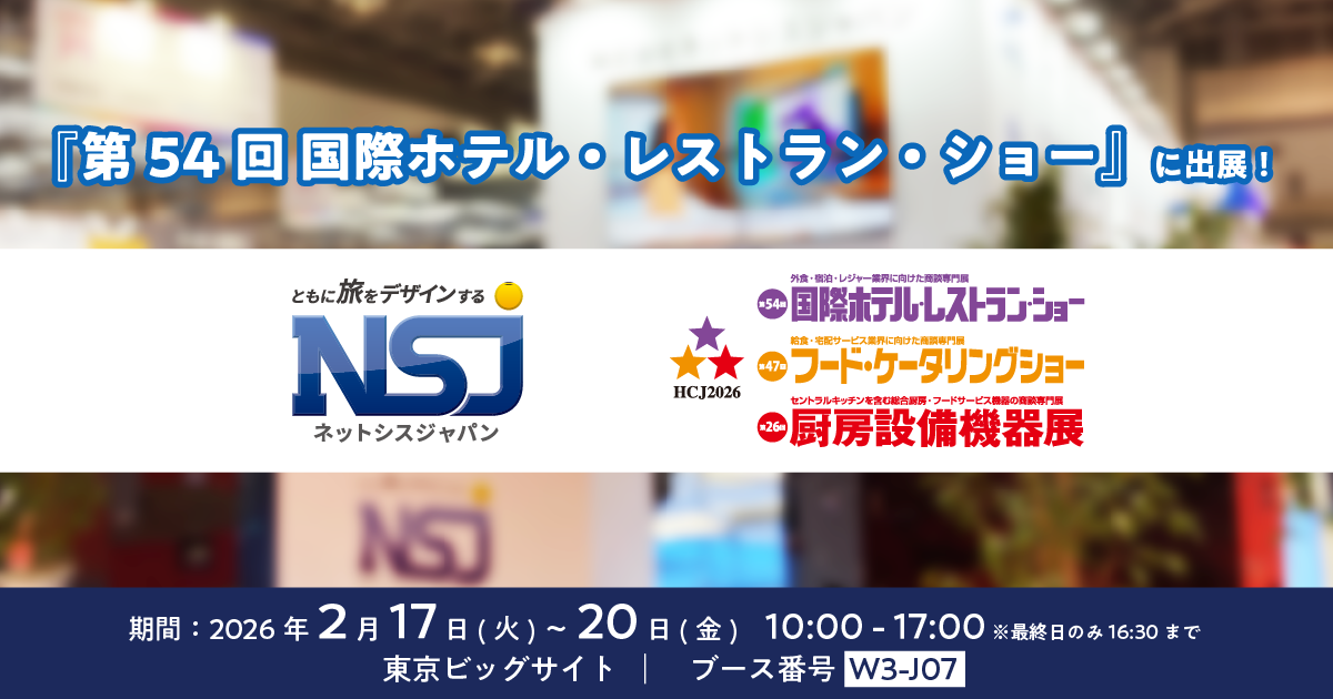 宿泊施設向けのトータルソリューションを提供する株式会社ネットシスジャパン(本社:東京都中央区、本店:新潟県新潟市/代表取締役:徳正 賢)は、2026年2月17日(火)~2月20日(金)の期間、東京ビッグサイトにて開催される「第54回 国際ホテル・レストラン・ショー HCJ2026」に出展いたします。