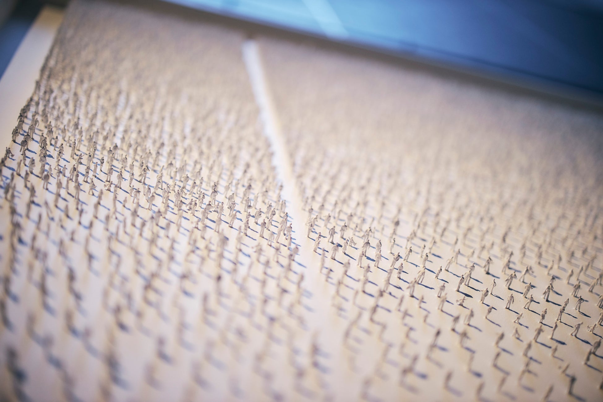 2cmほどのプラスチック人形をキャンバスにたくさん立たせることで、集合体の中で揺らぐ人間の行動心理を可視化、表現。様々な要素を限界までそぎ落とし、芸術の本質を求めるミニマリズムの構成により、人間社会と芸術における本質的な思考を巡らせる作品が多い。 -