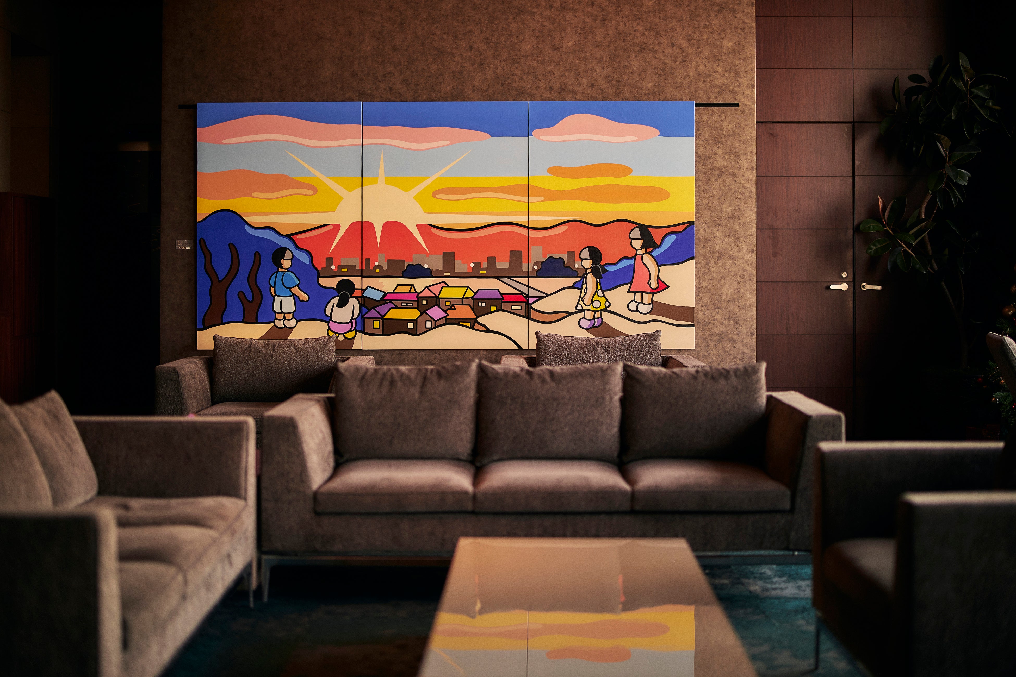 Through humorous and slightly awkward characters, Sato delivers warmth to viewers. Installed in the hotel space, his works harmonize with light and air, creating a new “winter time.”