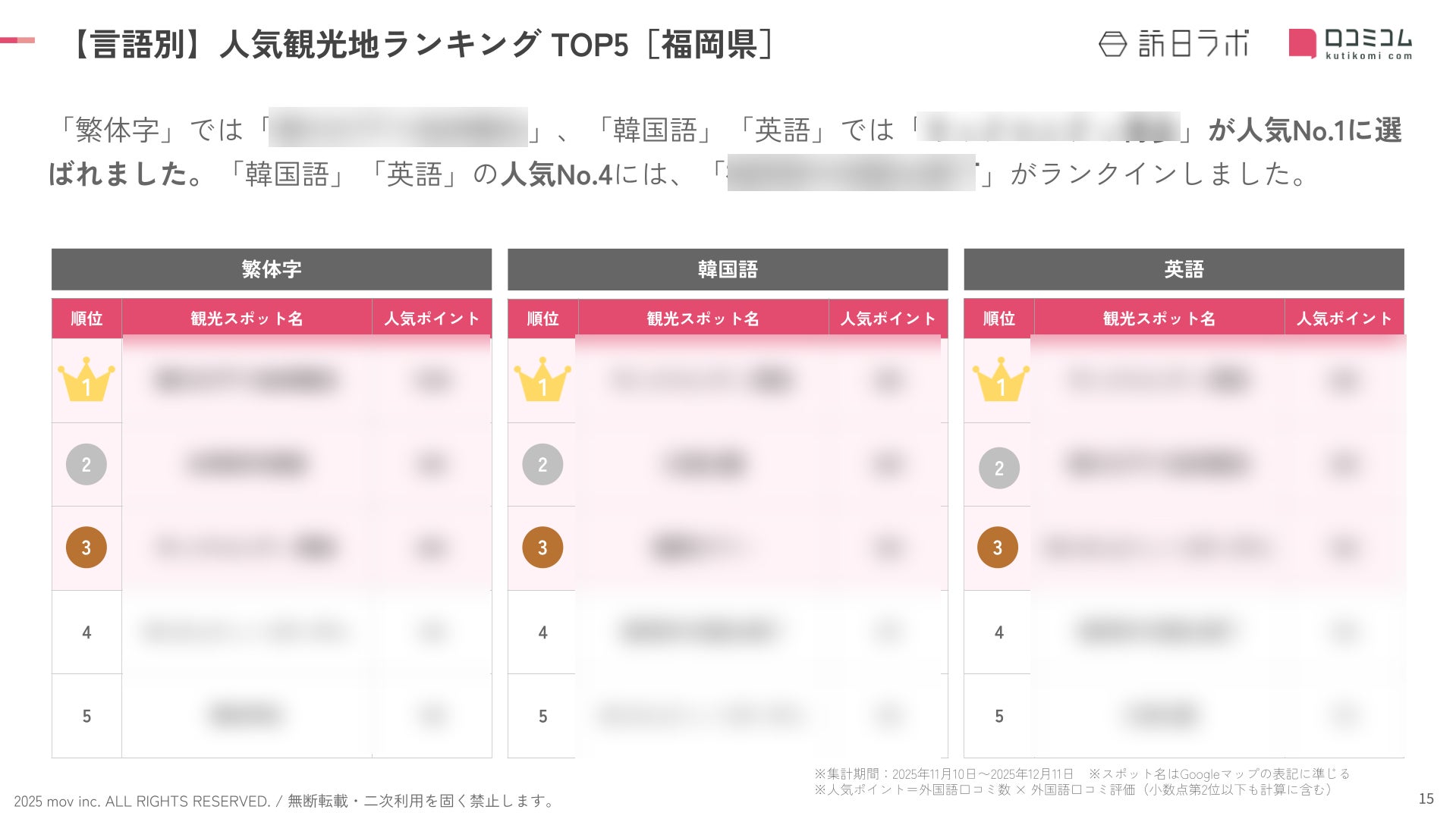 業界最大級のインバウンドビジネスメディア「訪日ラボ」及び 店舗向け集客一元化プラットフォーム「口コミコム」を運営する株式会社mov(代表取締役:渡邊 誠、本社:東京都渋谷区、以下mov)は、福岡県の観光地に寄せられた最新の口コミデータから、独自の『インバウンド人気観光地ランキング』を発表しました。