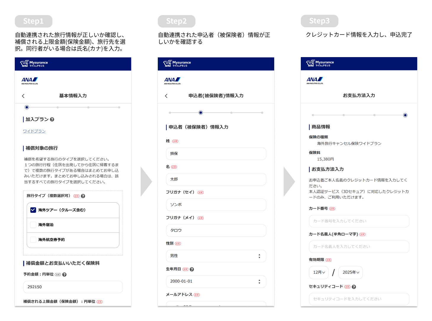 予約内容確認画面で「海外旅行キャンセル保険の案内を希望する」を選択※1いただいたお客様は、旅行予約完了後、ANAファシリティーズの保険案内のページに自動遷移し、そのままお手続きいただけるようになります。※2