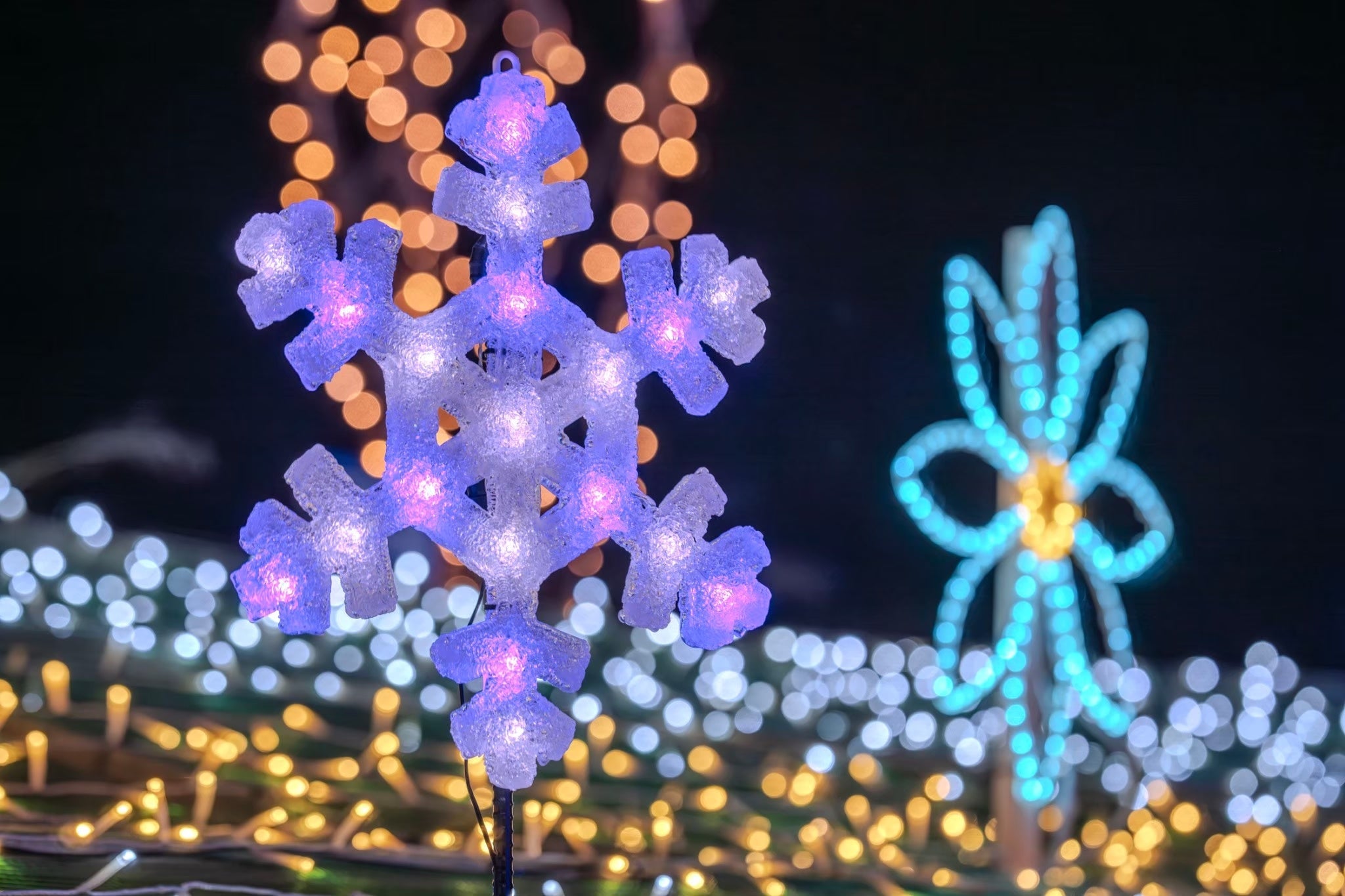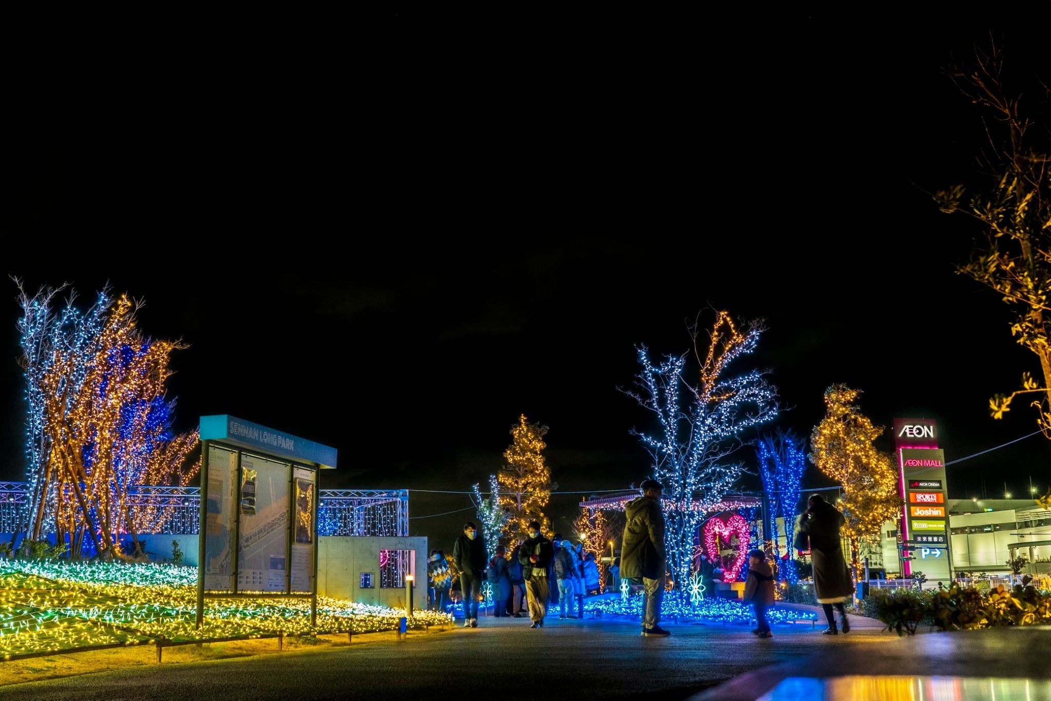 会場となるSENNAN LONG PARK(泉南りんくう公園)では、約7万5,000球のイルミネーションが一斉に点灯。海辺ならではの開放的なロケーションと光の演出が融合し、冬の夜を幻想的に彩ります。園内には光の回廊やフォトスポットが点在し、訪れる人々は散策しながら、心温まるひとときをお楽しみいただけます。