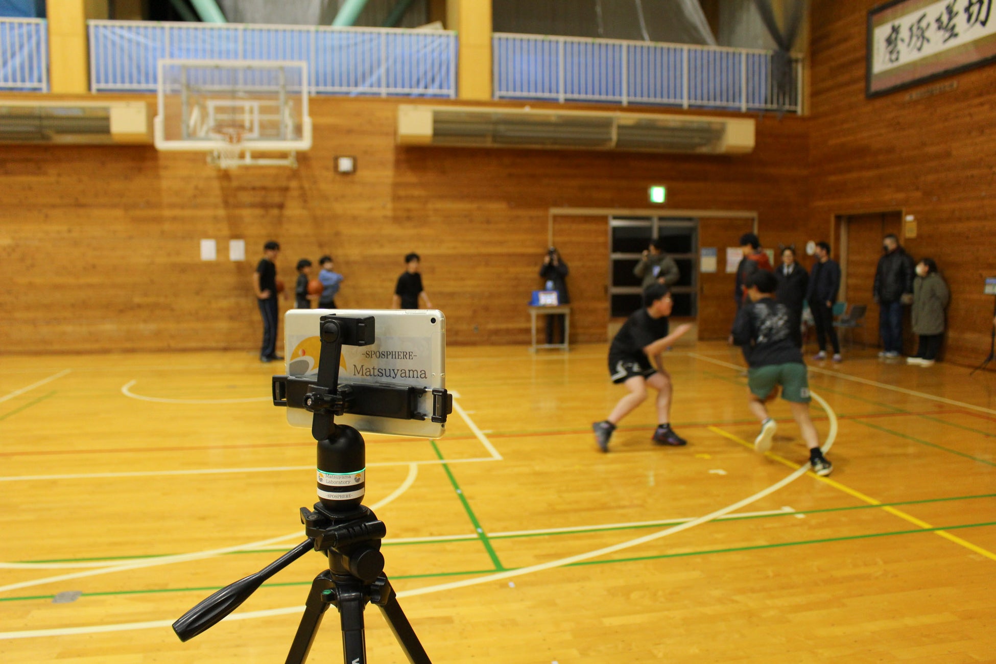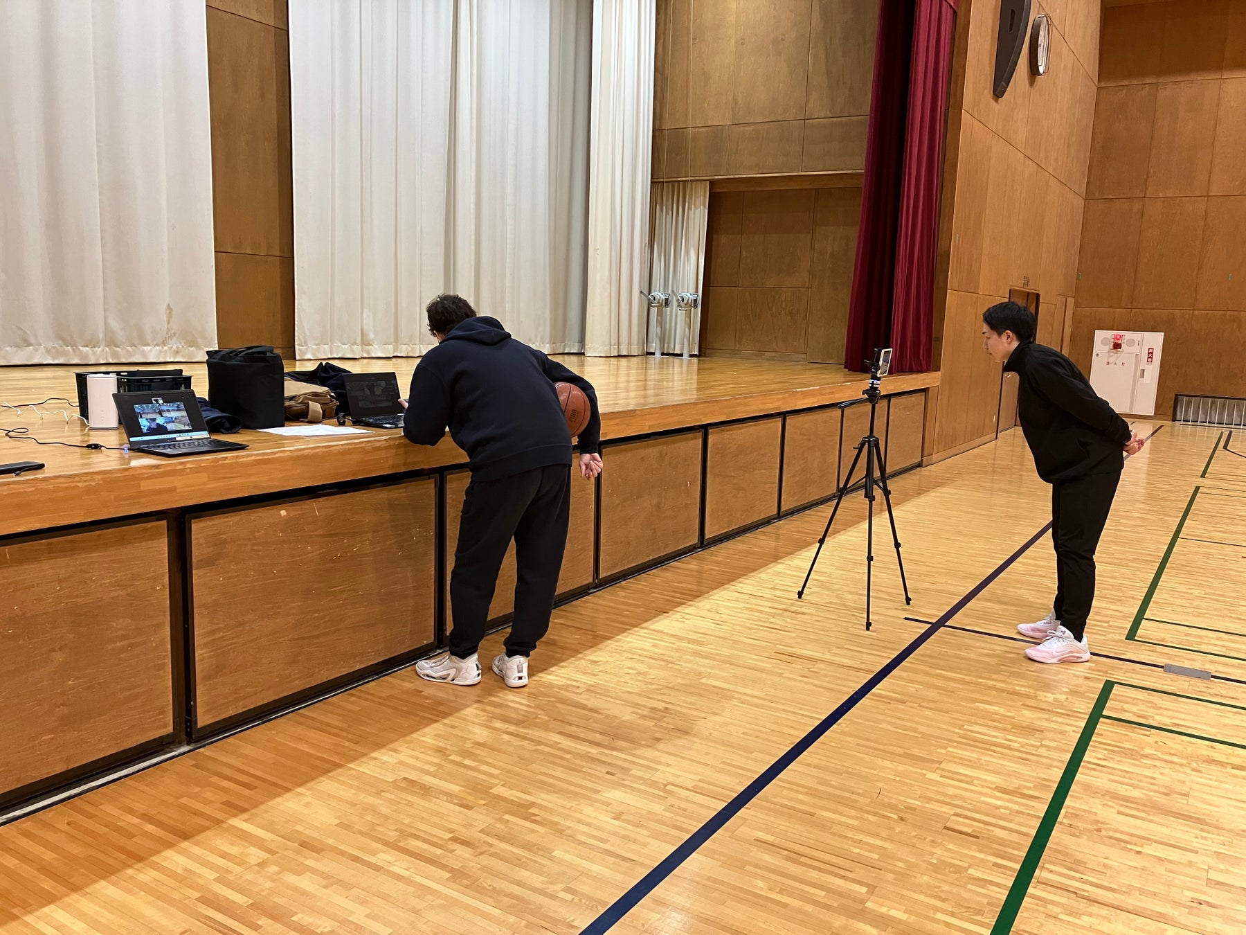 オンライン指導で欠かせないのが、長野市にいるコーチと生徒たちをつなぐオンラインツールです。この日は、3台のカメラに被写体を自動で認識・追跡する機能を持つAI(人工知能)を搭載した「AI三脚」を取り付けて使用しました。バスケットボールの素早い動きにも反応し、「AI三脚」付きのカメラが生徒の動きを自動で追尾するため、遠隔にいるコーチでも様々な角度からリアルタイムで映像を確認することができます。