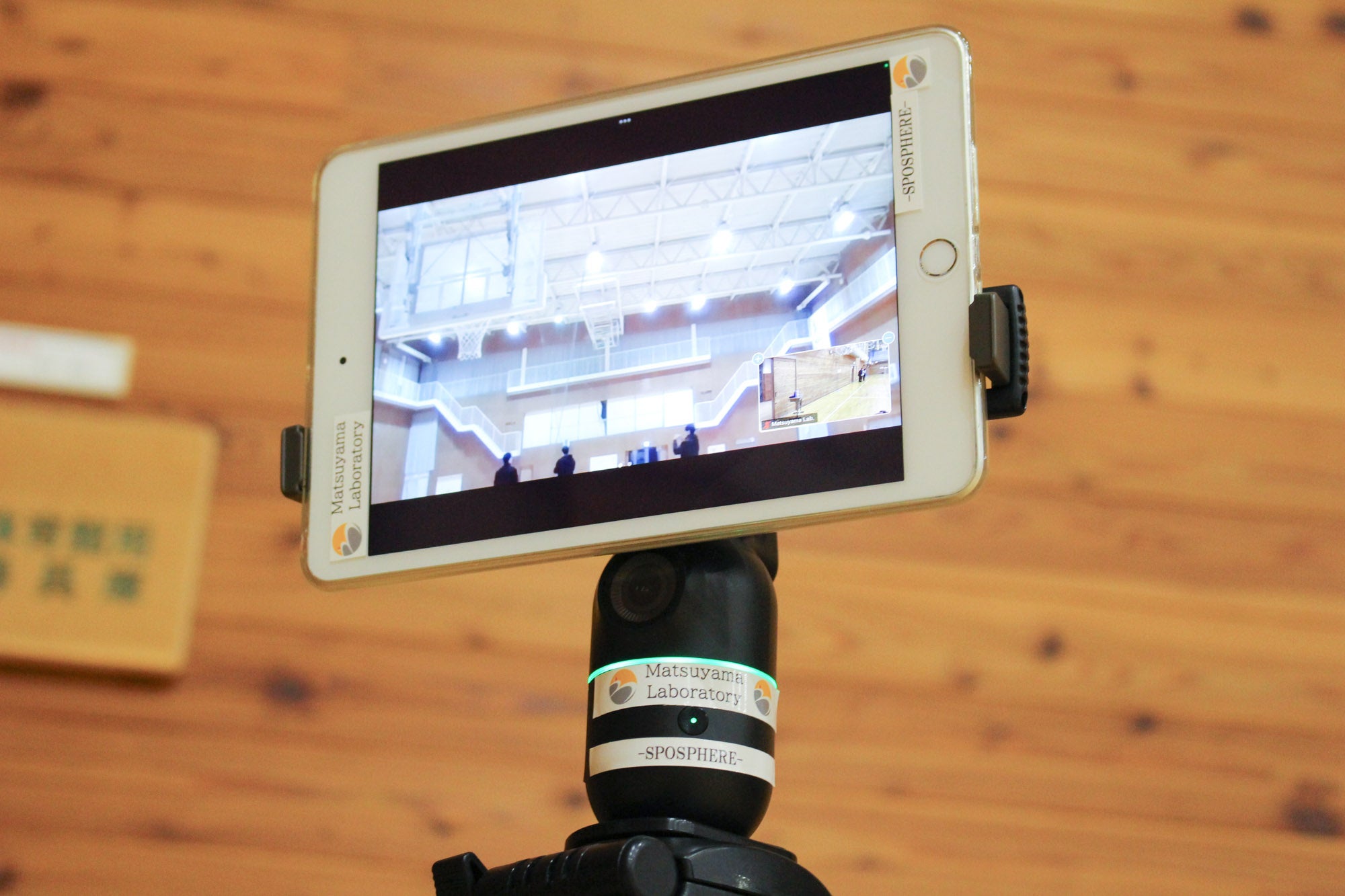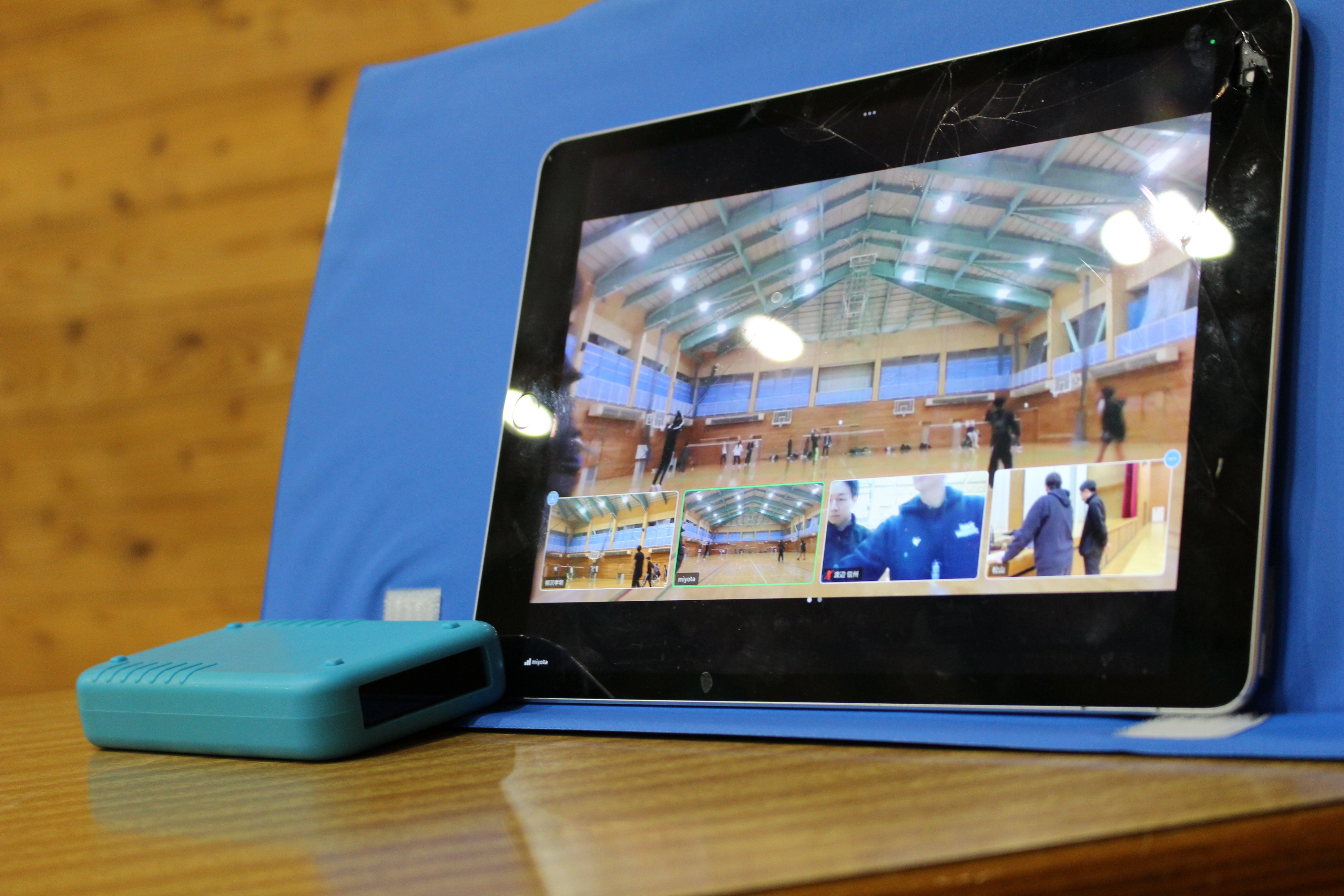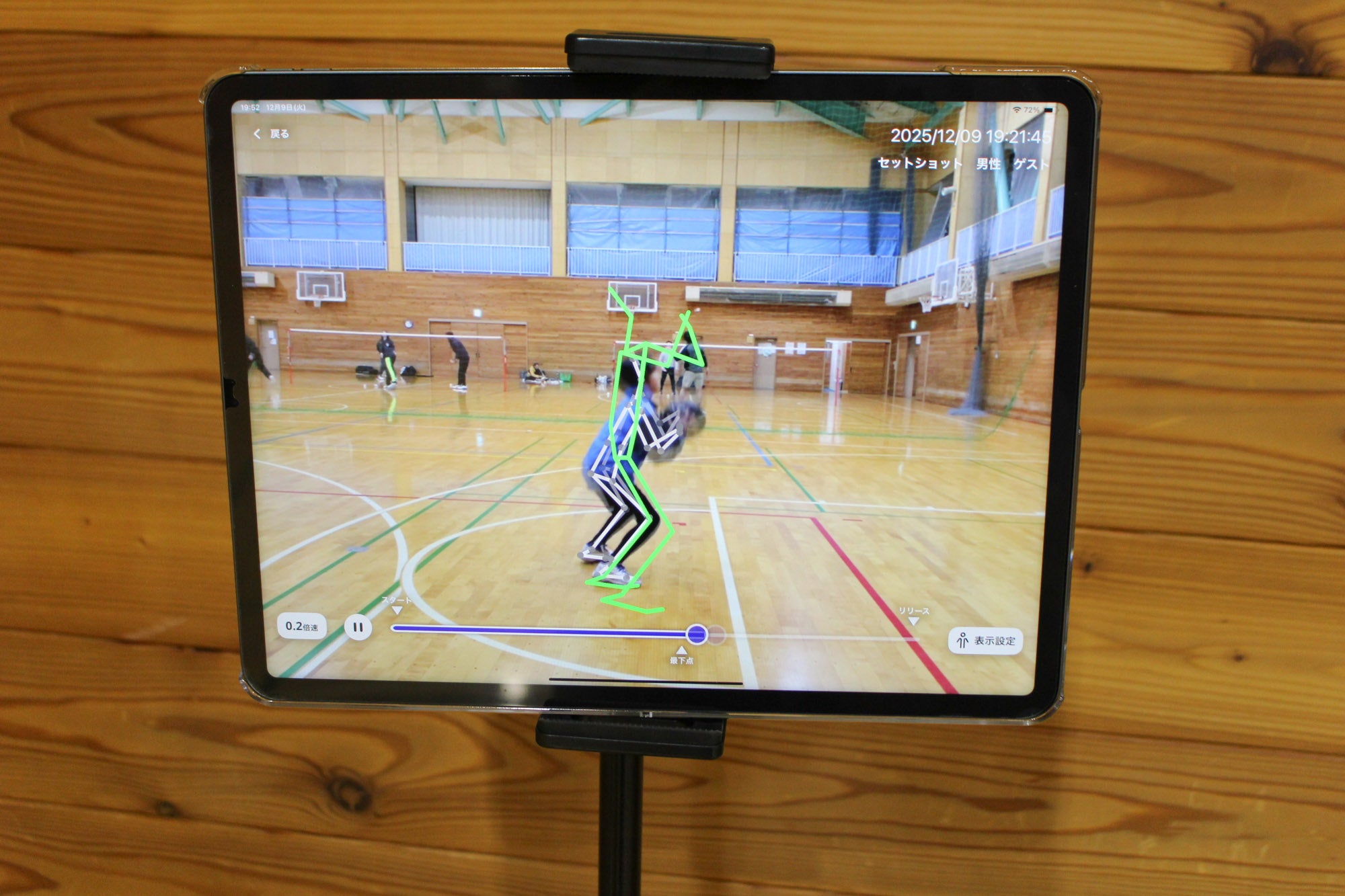オンライン指導で欠かせないのが、長野市にいるコーチと生徒たちをつなぐオンラインツールです。この日は、3台のカメラに被写体を自動で認識・追跡する機能を持つAI(人工知能)を搭載した「AI三脚」を取り付けて使用しました。バスケットボールの素早い動きにも反応し、「AI三脚」付きのカメラが生徒の動きを自動で追尾するため、遠隔にいるコーチでも様々な角度からリアルタイムで映像を確認することができます。