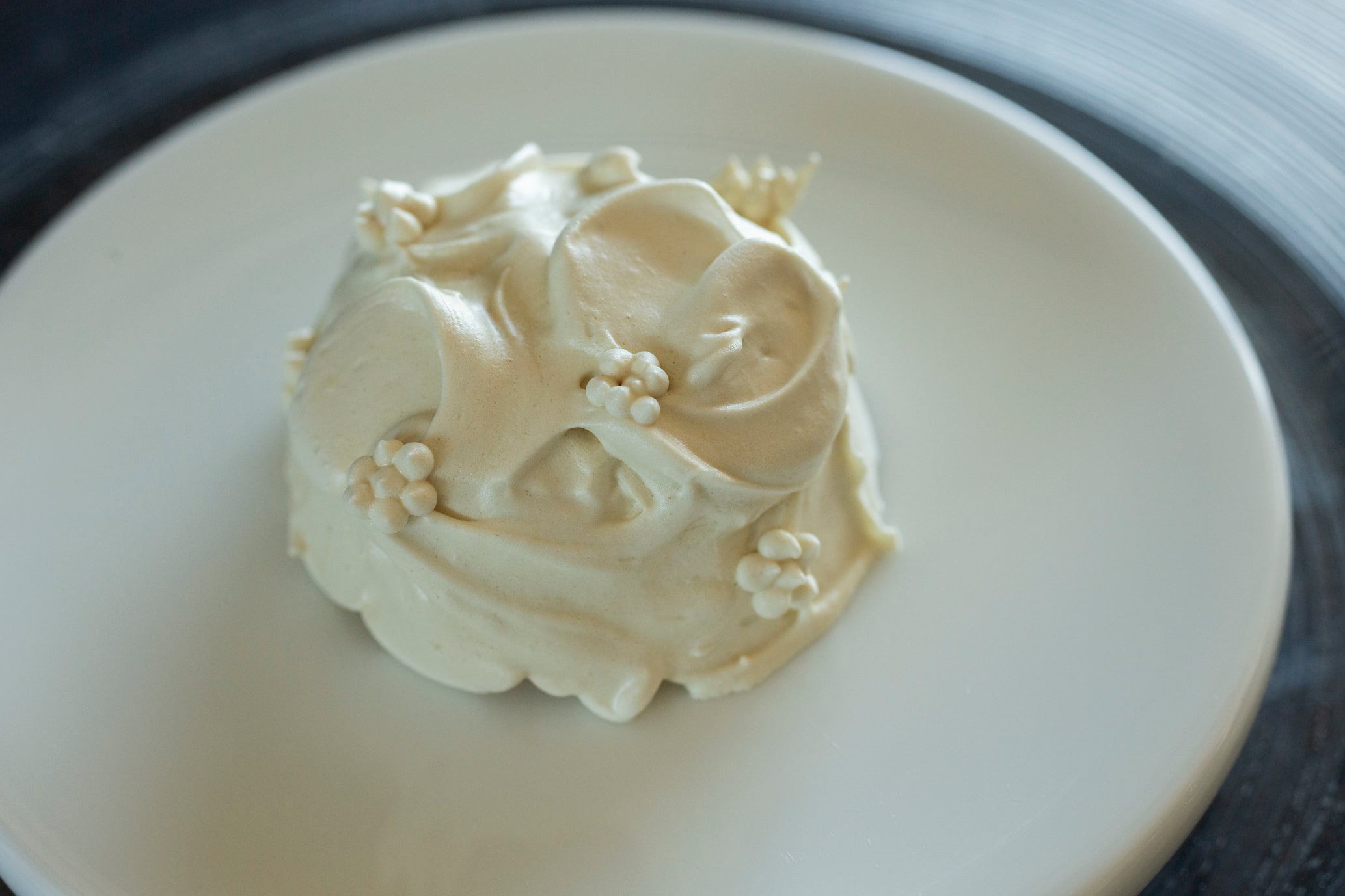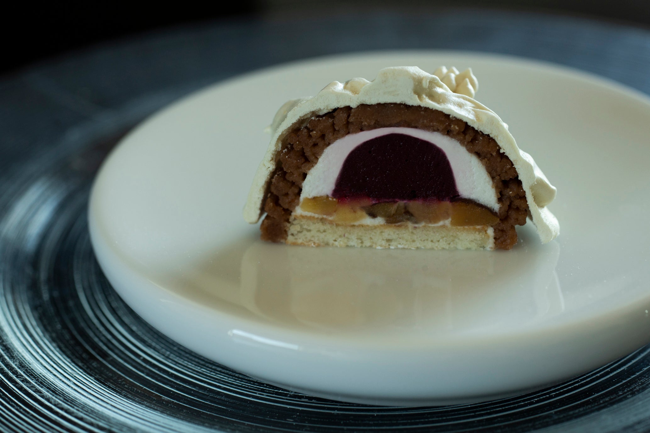 プランシグネチャースイーツは、HANROの世界観を表現したメレンゲクッキーです。メレンゲクッキーの中には、モンブランが入っており、ラムシロップ入りクレームマロン、クレームシャンティ、クレームカシス、ビスキュイダコワーズなどの多様な味わい、カシスの酸味とメレンゲの甘さの調和などをお楽しみいただけます。