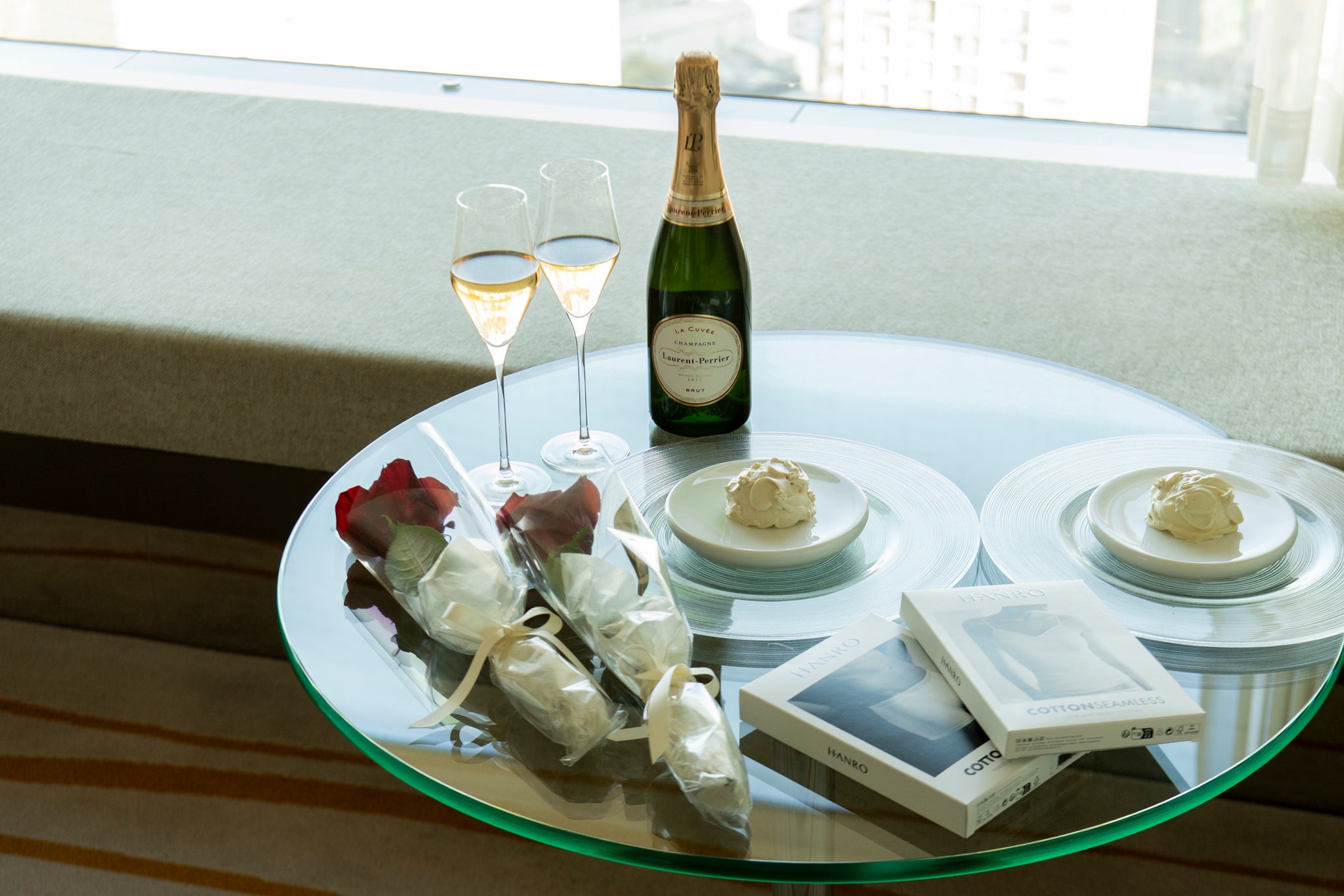 本プランでは、パティシエが手掛けた特製の限定スイーツをお楽しみいただけます。上質なシルケット加工をほどこした光沢感のあるコットン素材や繊細なレースの艶やかさなど、細部にわたりHANROの世界観を表現したメレンゲクッキーのスイーツをシャンパンと共にお部屋にお届けします。クッキーの中にはカシスの酸味をきかせたモンブランが入っており、このプランでしか味わえない、メレンゲの甘さとの調和をご堪能いただけます。高層階のプライベートな客室で、煌めく都心の夜景を眺めながら過ごすひとときに一輪のバラが上品な華やぎを添えます。