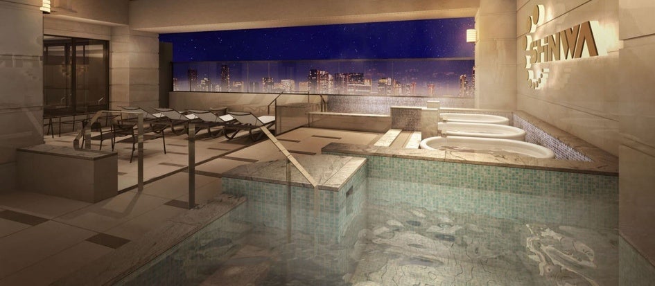 地上14階にある天空の露天風呂では、満天の星空や大阪ベイエリアの景色を眺めながら温泉に浸かることが可能。男女とも6種類の浴槽に加え、サウナも用意。