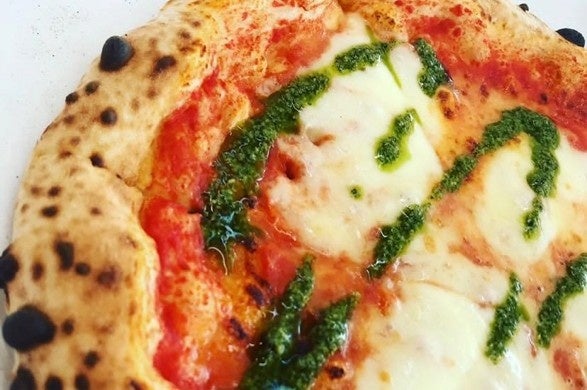 石窯で焼いた本格ナポリピッツァ、串焼きなど販売。独自の配合で作り上げたピザ生地の中はもっちり、外はカリッと絶品!