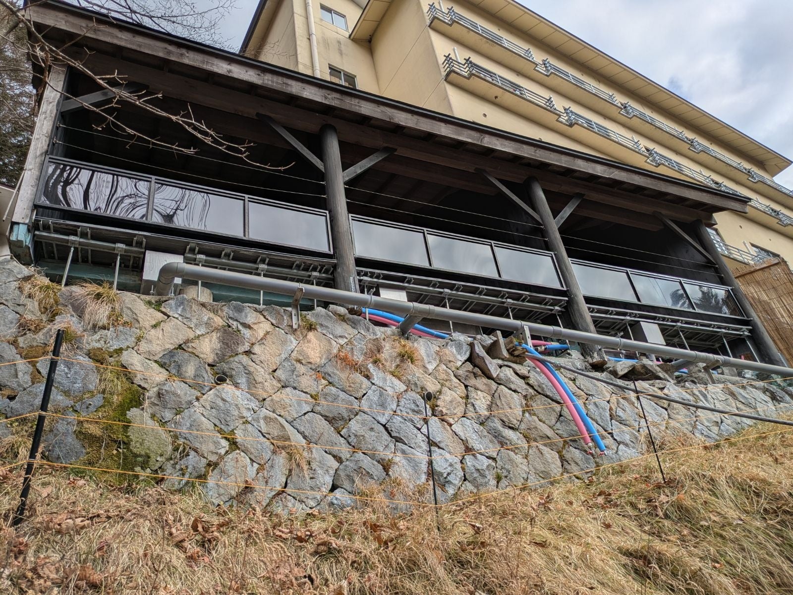今年の漢字に熊が選ばれるなど、昨今、熊による被害が連日報道されております。中には、露天風呂を清掃中のスタッフが熊に襲われるなど、旅館業界にとってとてもショッキングなニュースもありました。また、自動ドアを通り抜けてスーパーに入り込むなど、本来便利な機能が危険を呼ぶ可能性すらでてきました。こういった事例を受け、当館ではこれまでに熊の被害や目撃情報はないものの、未然に防ぐ安全対策として、露天風呂エリア全体を囲う形で、熊の侵入を防ぐ電気柵を設置いたしました。同時に自動ドアに関しても安全面から手動ドアに切り替える工事を行いました。冬の始まりではありますが、冬眠しない熊なども話題となっているため、この時期の導入は決して遅くないと考えております。