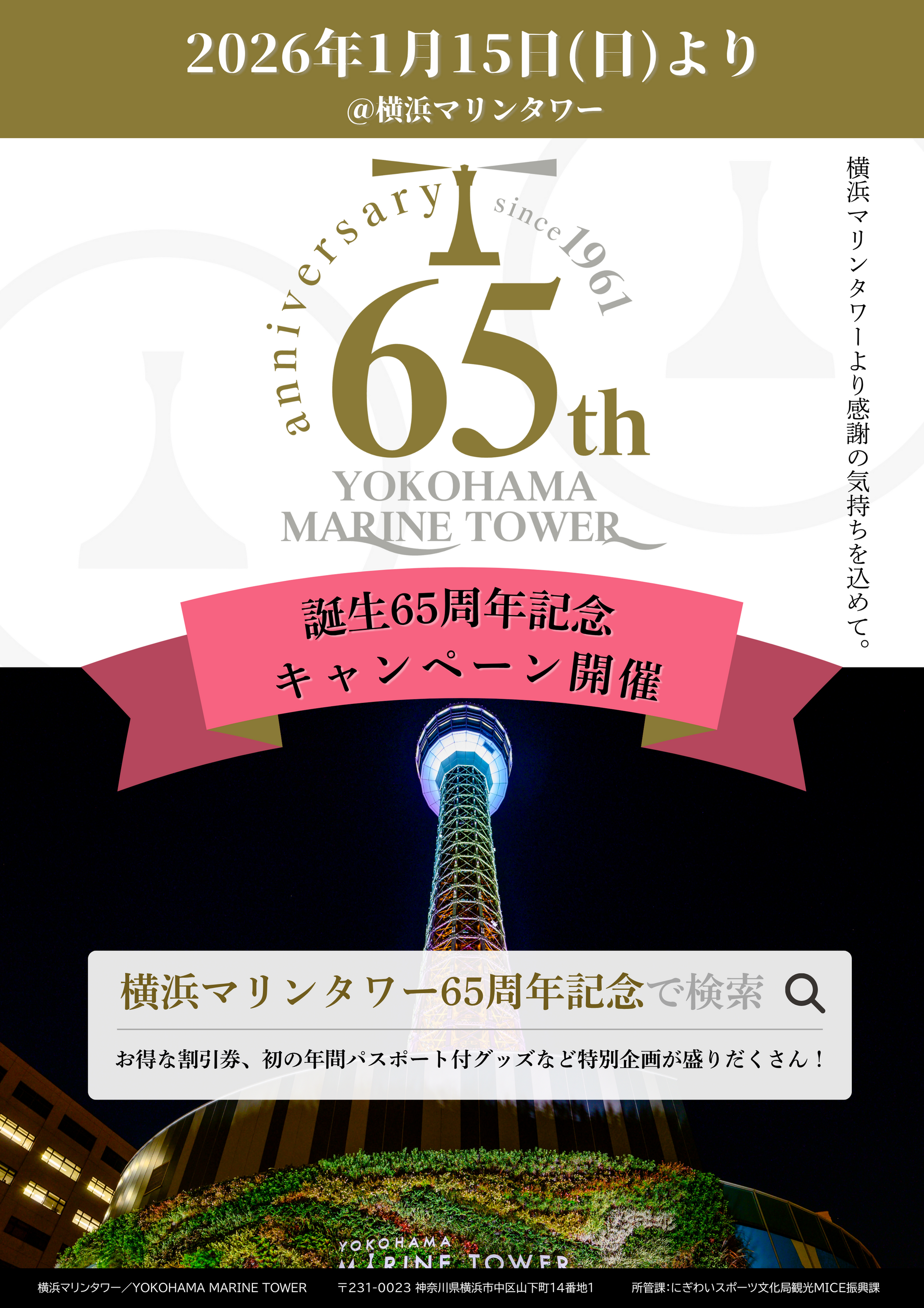 総合不動産企業リスト株式会社(本社:横浜市、代表:北見尚之)グループのリストプロパティーズ株式会社(本社:横浜市、代表:北見尚之)を中心とした共同事業体が運営を行う「横浜マリンタワー」は、2026年1月15日(木)で65周年を迎えます。日頃のご愛顧への御礼として、皆さまにお楽しみいただける特別企画を実施いたします。これからも地域に愛されるシンボルとして、皆さまとともに歩み、新たな魅力を育み続ける場所を目指してまいります。そして、新しい横浜の魅力をこの場所から発信し続けてまいります。