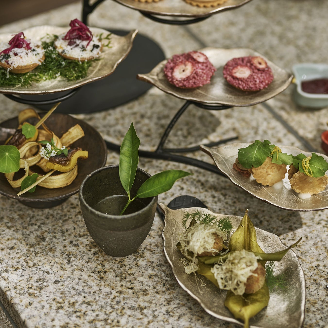 パティーナ大阪の19階に位置するティーラウンジ「にじり」では、カカオの魅力を多彩に表現した “チョコレート” をテーマに、香り・質感・味わいの奥深さを堪能できるメニューをご用意いたしました。セイボリーには、カカオのほのかな苦みや香ばしさを重ね、深みのある味わいと軽やかな食感のコントラストを加えることで、チョコレートの新たな表情を引き出しています。スイーツには果実やナッツを合わせ、カカオが持つやさしい甘みや繊細なニュアンスをさらに際立たせました。