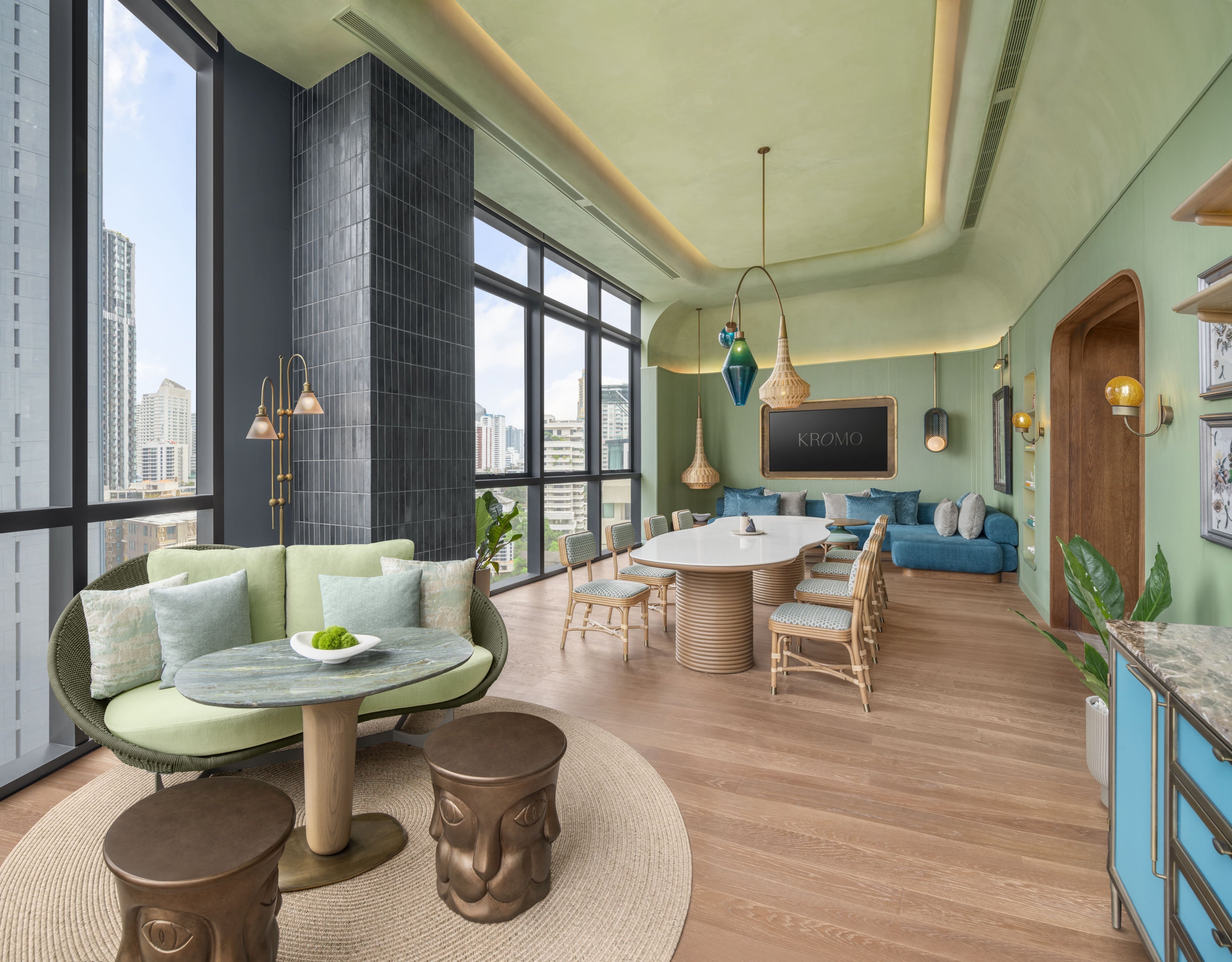 建物に反射するダイヤモンドのような煌めきから、万華鏡のような料飲施設「Colette(コレット)」のエントランスへと続き、10階のロビーへと足を進めます。ロビーは、都市の喧騒の上に静かに佇む静穏の空間として設計されました。エメラルドの色調に包まれた空間には、デザイナーKorakot Aromdee氏による雲や木々をモチーフにした彫刻が、バンコクの上空に広がるベールのような幻想的な雰囲気を醸し出しています。また、インテリア用品ブランドPATAPiANの風に舞う種の彫刻や、Angel Hatの遊び心溢れる照明が空間に驚きと楽しさを演出しています。