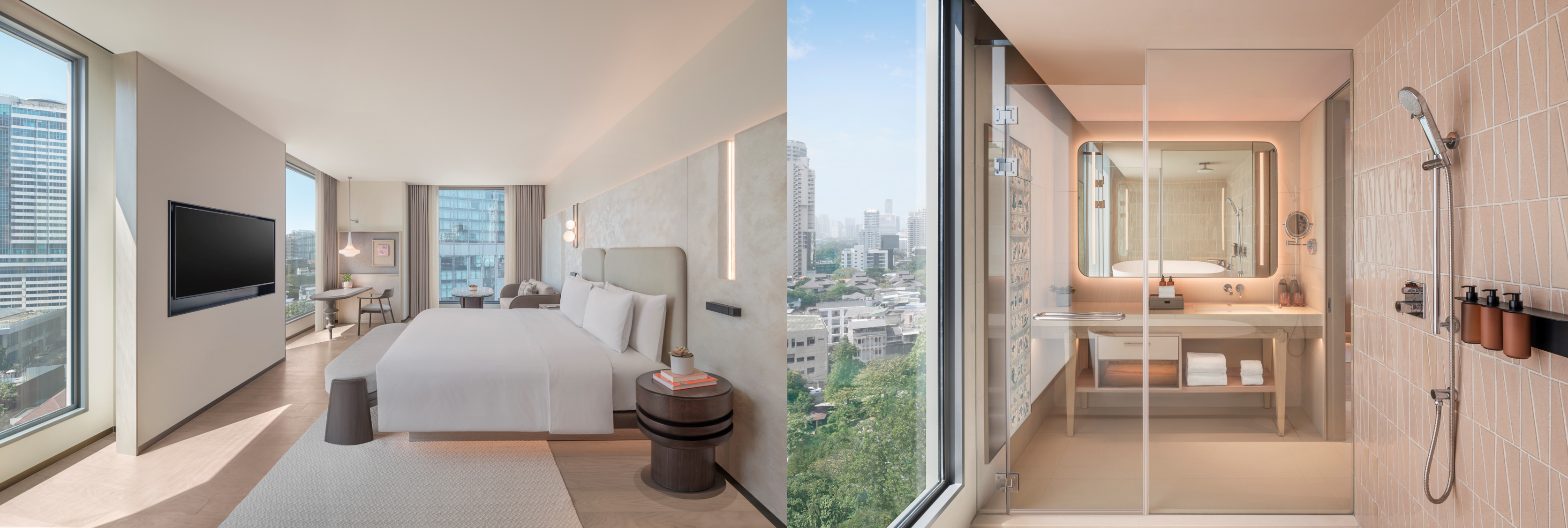 客室には、タイのビジュアルアーティストNakrob Moonmanas氏による緻密なイラストが、バスローブやミラーパネル、スイートの壁画、さらには引き出しの内側にまで描かれ、お客様が思わず細部まで探求したくなるこだわりと驚きが詰まっています。すべての客室と廊下のインテリアはLuxeLife Studioが手掛け、快適さとスタイルを両立させた考え抜かれた空間を提供しています。