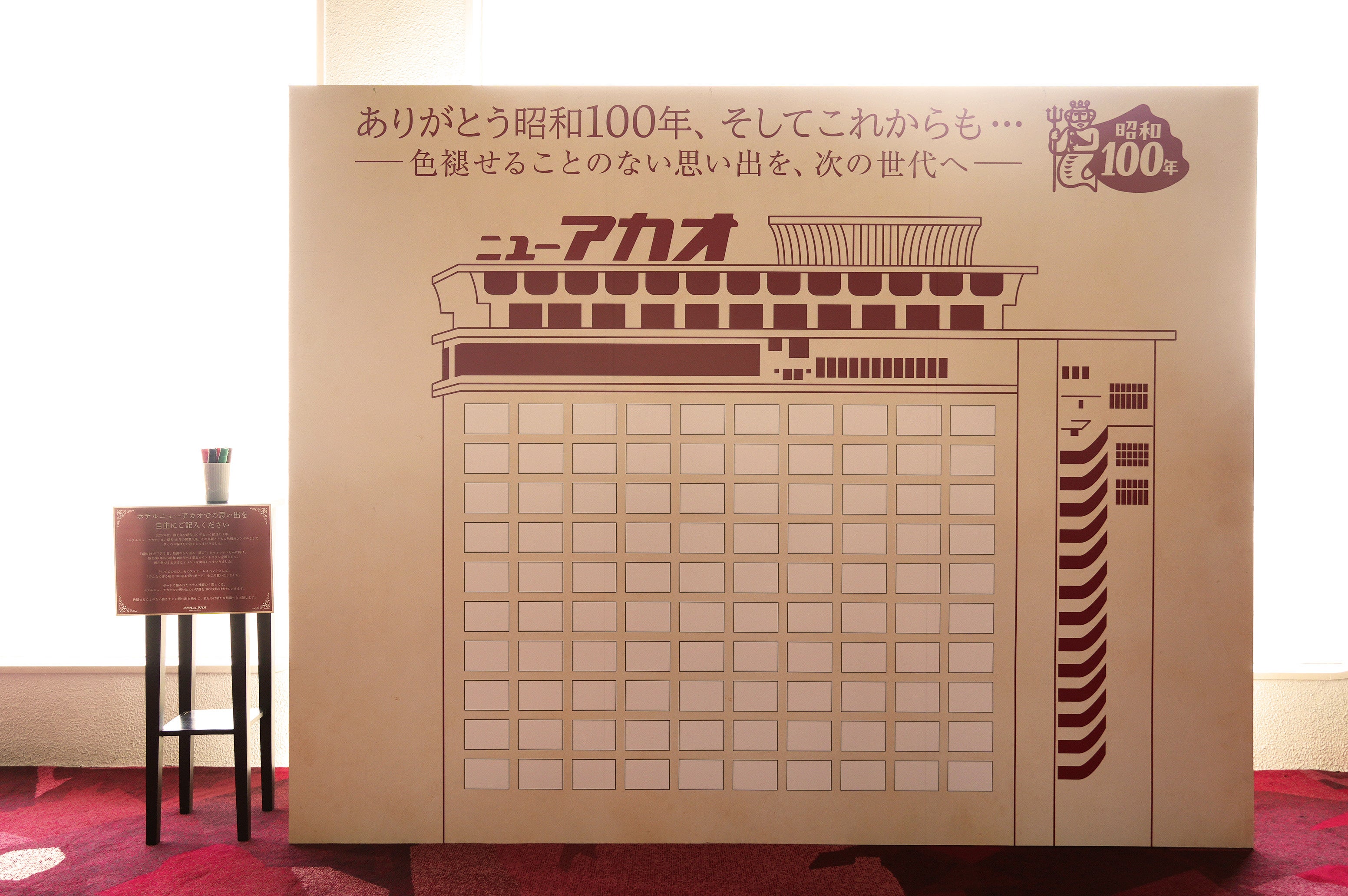 昭和100年のフィナーレイベントとして、17階ロビーに「みんなで作る昭和100年お祝いボード」をご用意。ボードにはご来館いただいたお客様のニューアカオでの思い出をご記入いただけます。