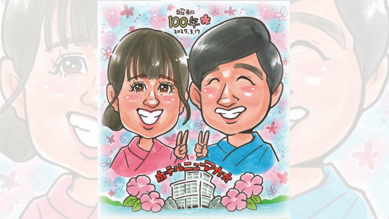 ホテルニューアカオオリジナルのフレームに、プロの作家がお客様の似顔絵を描くワークショップです。旅の思い出や年末の記念として、おひとりでも、ご家族でも、特別な一枚をお持ち帰りいただけます。