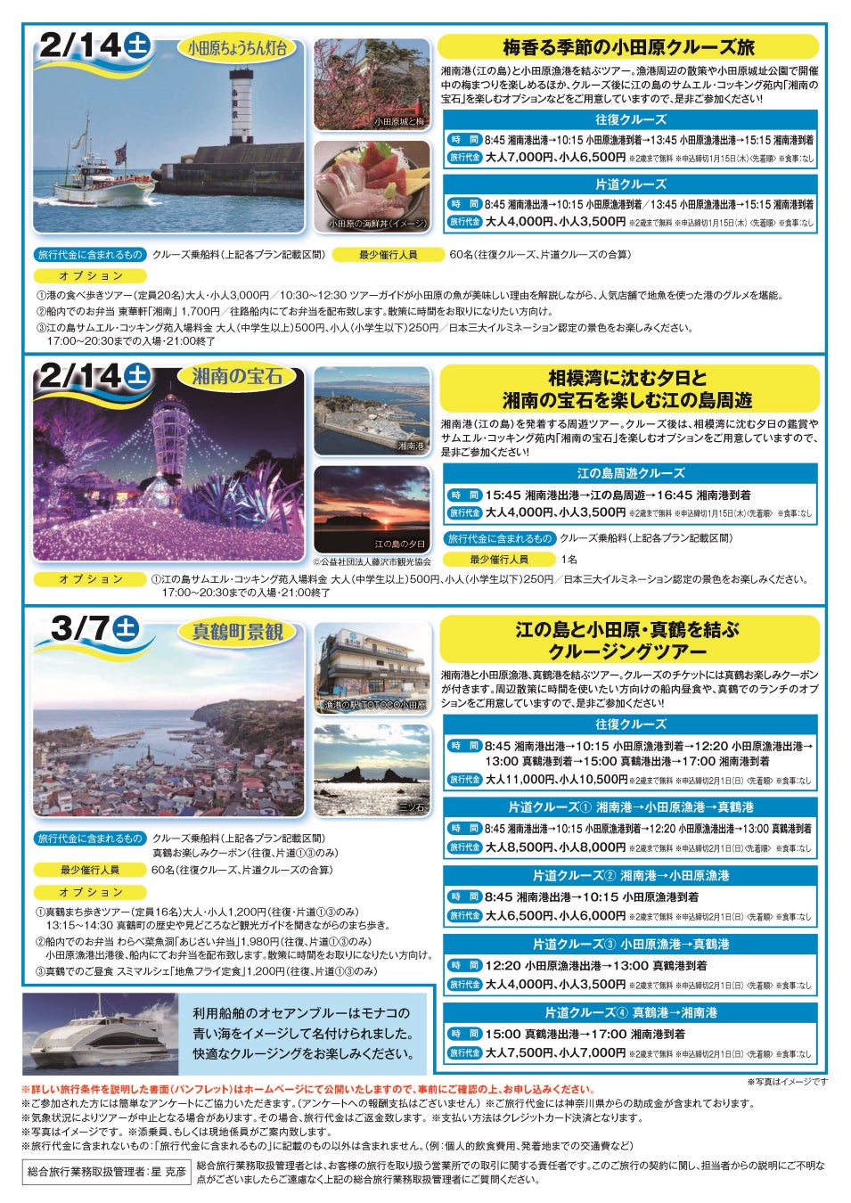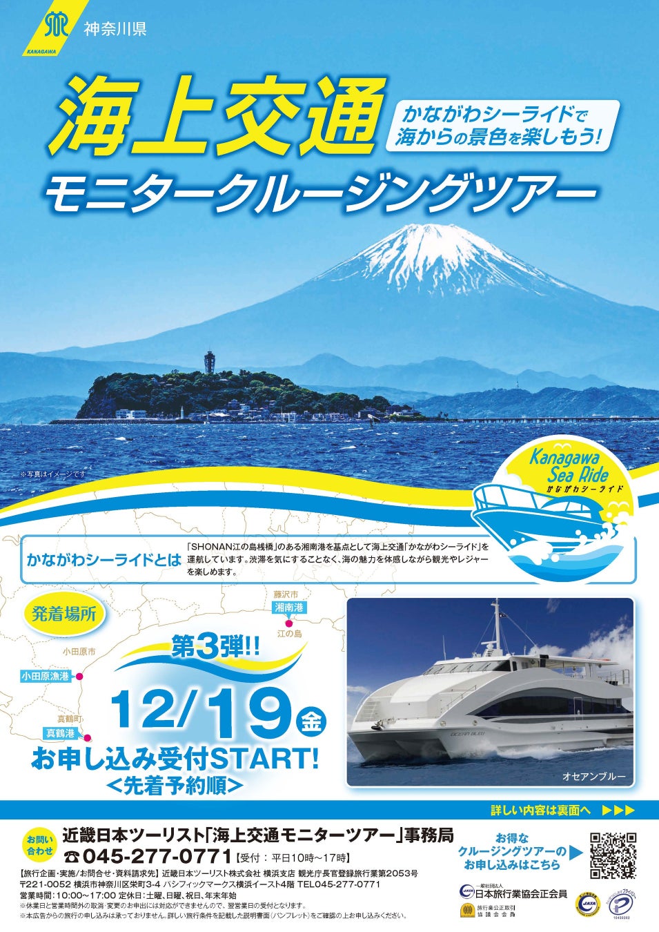 湘南港と葉山マリーナや大磯港等を結んでいる海上交通「かながわシーライド」を大磯より西側に広げていくため、小田原漁港と真鶴港を活用した実証実験として、モニタークルージングツアー(第3弾)を令和8年2月から3月に実施しますので、お知らせします。