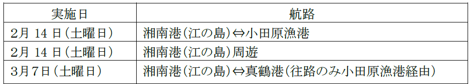 湘南港と葉山マリーナや大磯港等を結んでいる海上交通「かながわシーライド」を大磯より西側に広げていくため、小田原漁港と真鶴港を活用した実証実験として、モニタークルージングツアー(第3弾)を令和8年2月から3月に実施しますので、お知らせします。