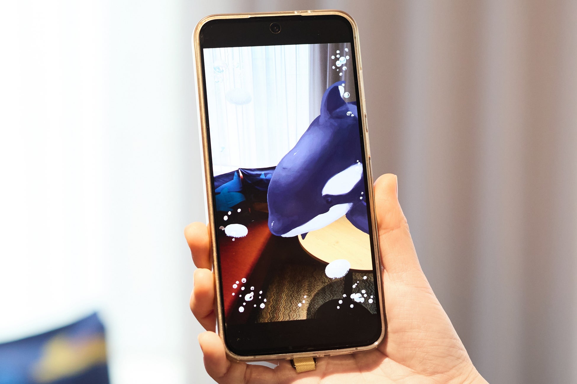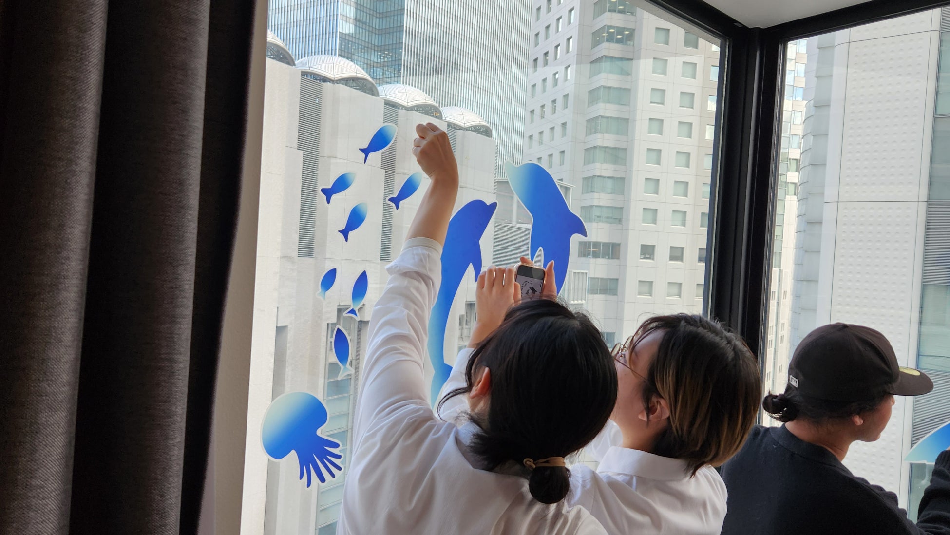 さらに、今回のアートルームではAR技術を活用し、客室内にシャチやクラゲを出現させ、一緒に写真撮影ができる仕掛けが導入されており、参加したメディア関係者は、この最新技術を用いた体験と、学生たちの緻密なアイデアと表現力にも関心を示しました。制作物のコンセプトや細部にわたる工夫を熱心に取材する様子が見られました。