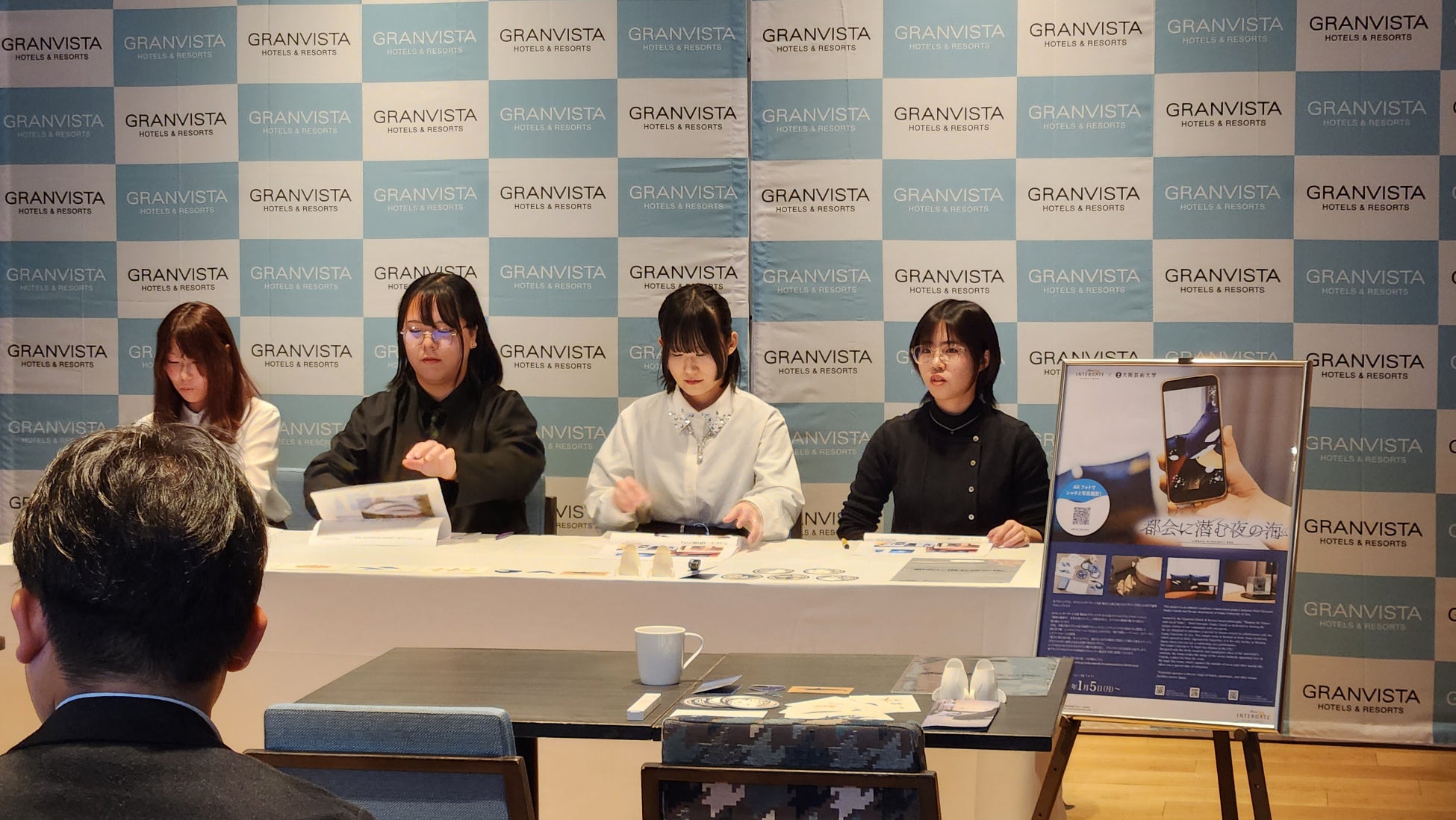 その後、プロジェクトに携わった学生4名よりアートルームの詳細に関するプレゼンテーションが実施されました。学生たちは、「神戸須磨シーワールドのもつ魅力を、ホテルインターゲート大阪 梅田の完成された空間に調和させ、どのように表現できるかを深く考えました。」と話し、学生ならではの視点が生かされたアートルームの魅力が伝えられました。