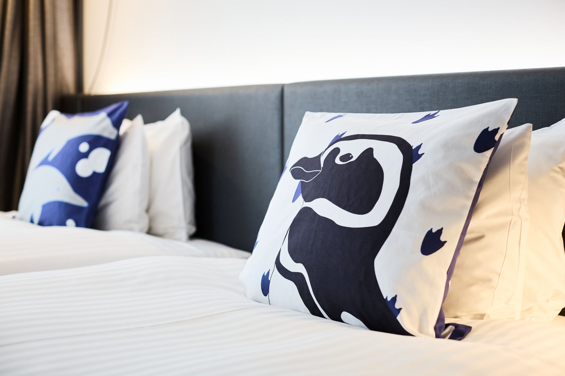 客室内には、学生たちが制作した多彩なアート作品が配置されています。神戸須磨シーワールドで展示している生きものをデザインしたシャンプーボトルや窓ステッカー、クッションに加え、海中を泳ぐシャチを再現した海中ジオラマ、ギヤマンクラゲやチンアナゴをデザインしたネオンなど、多彩なアイテムで夜の海の世界が表現されています。また、コースターやシャチをかたどった歯ブラシ立てなどお持ち帰りアイテムも充実しており、細部までこだわったアートルームとなっています。