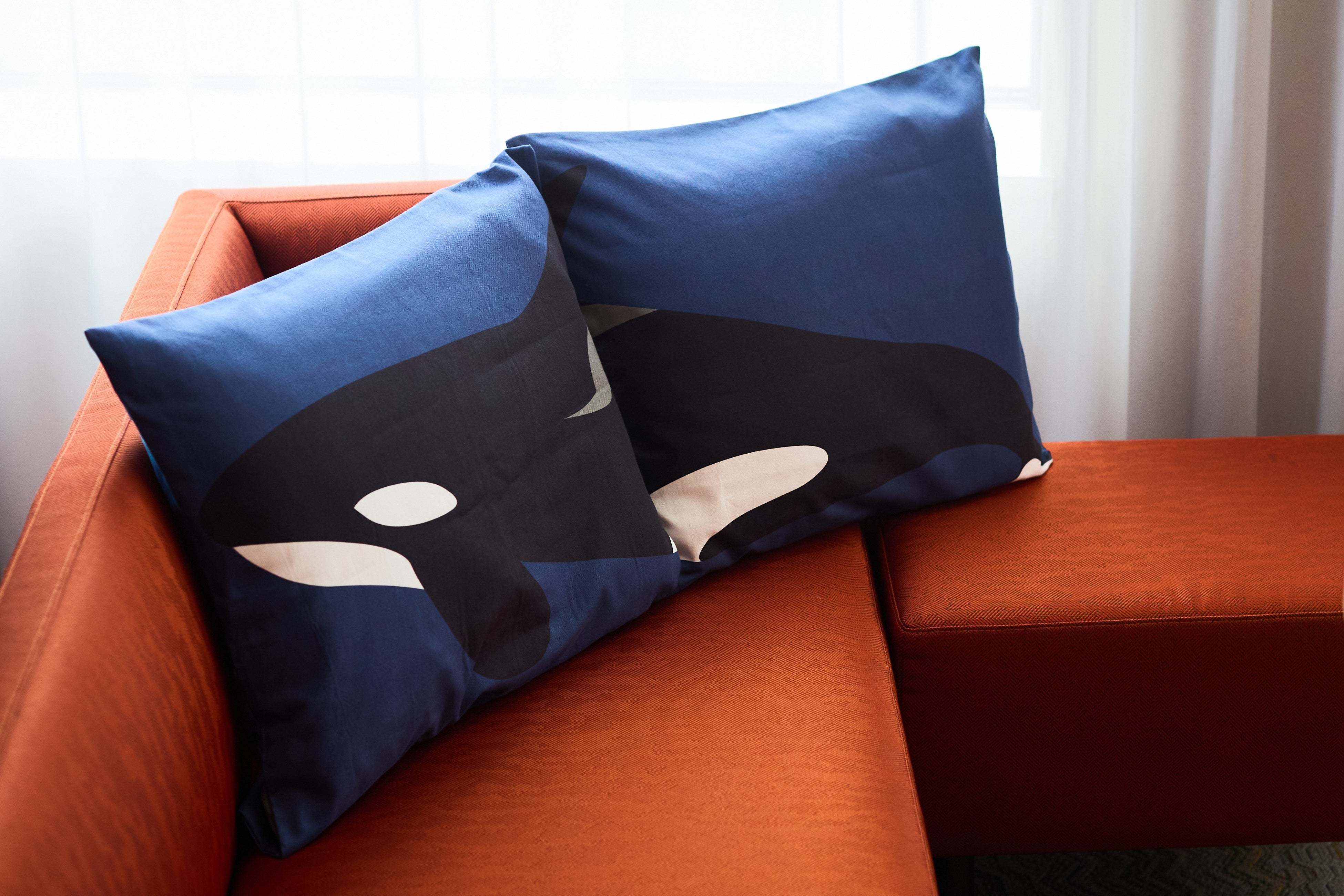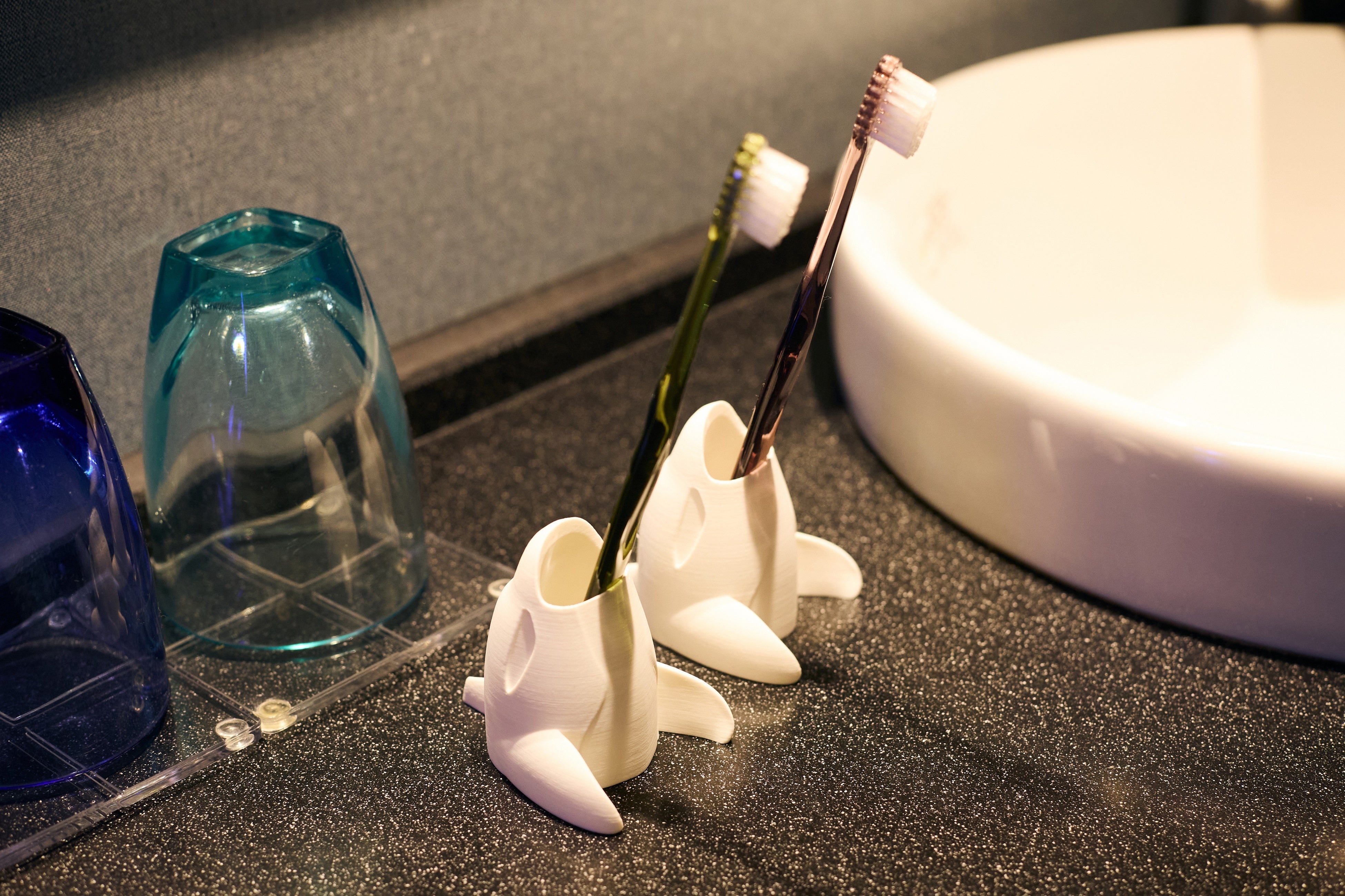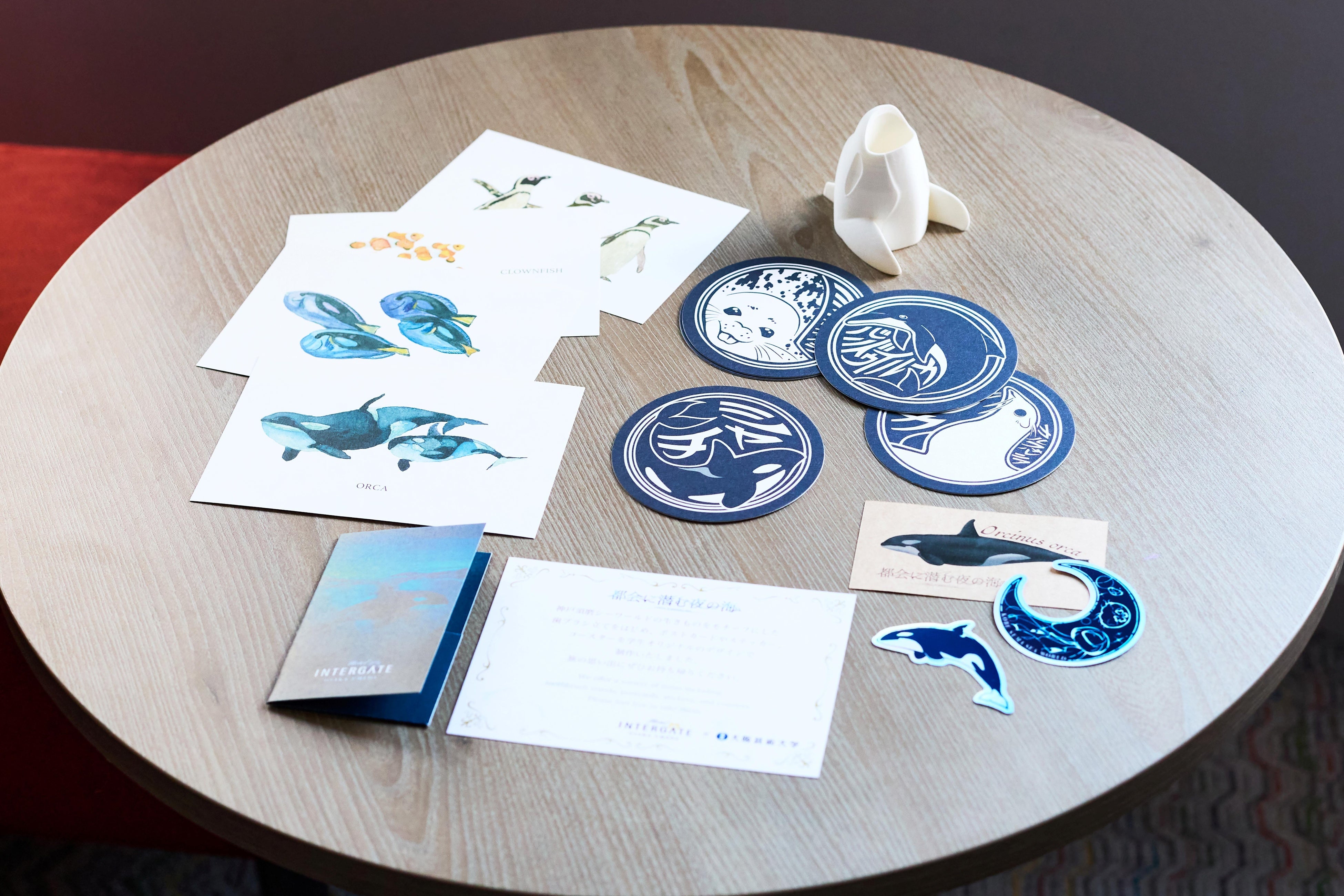 客室内には、学生たちが制作した多彩なアート作品が配置されています。神戸須磨シーワールドで展示している生きものをデザインしたシャンプーボトルや窓ステッカー、クッションに加え、海中を泳ぐシャチを再現した海中ジオラマ、ギヤマンクラゲやチンアナゴをデザインしたネオンなど、多彩なアイテムで夜の海の世界が表現されています。また、コースターやシャチをかたどった歯ブラシ立てなどお持ち帰りアイテムも充実しており、細部までこだわったアートルームとなっています。